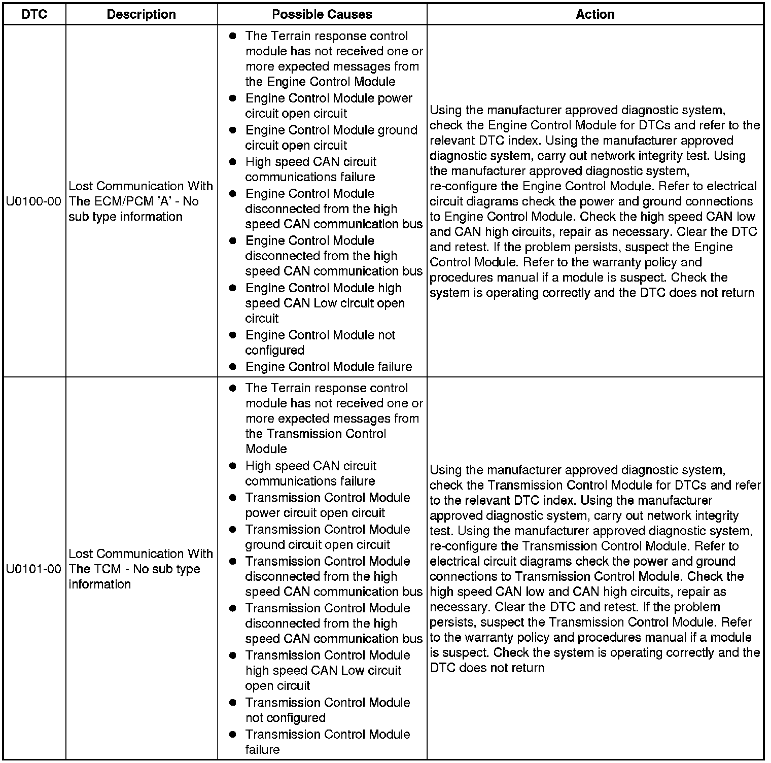 The table below lists all Diagnostic Trouble Codes (DTCs) that could be logged in the All Terrain Control Module, for additional Diagnosis and Testing information refer to the relevant Diagnosis and Testing Section. For additional information, refer to Ride and Handling Optimization Ride and Handling Optimization
