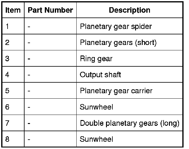 Engine torque is transferred, via operation of single or combinations of clutches to the 2 planetary gear trains. Both gear trains are controlled by reactionary inputs from brake clutches to produce the 6 forward gears and 1 reverse gear. The ratios are as follows: