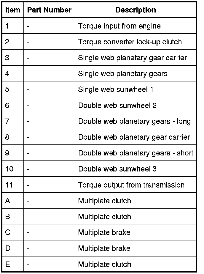 The shift elements are three rotating multiplate clutches (A, B and E) and two fixed multiplate brakes (C) and D). All shifts from 1st to 6th gears are power-on overlapping shifts. Overlapping shifts can be described as one of the clutches continuing to transmit drive at a lower main pressure until the next required clutch is able to accept the input torque.