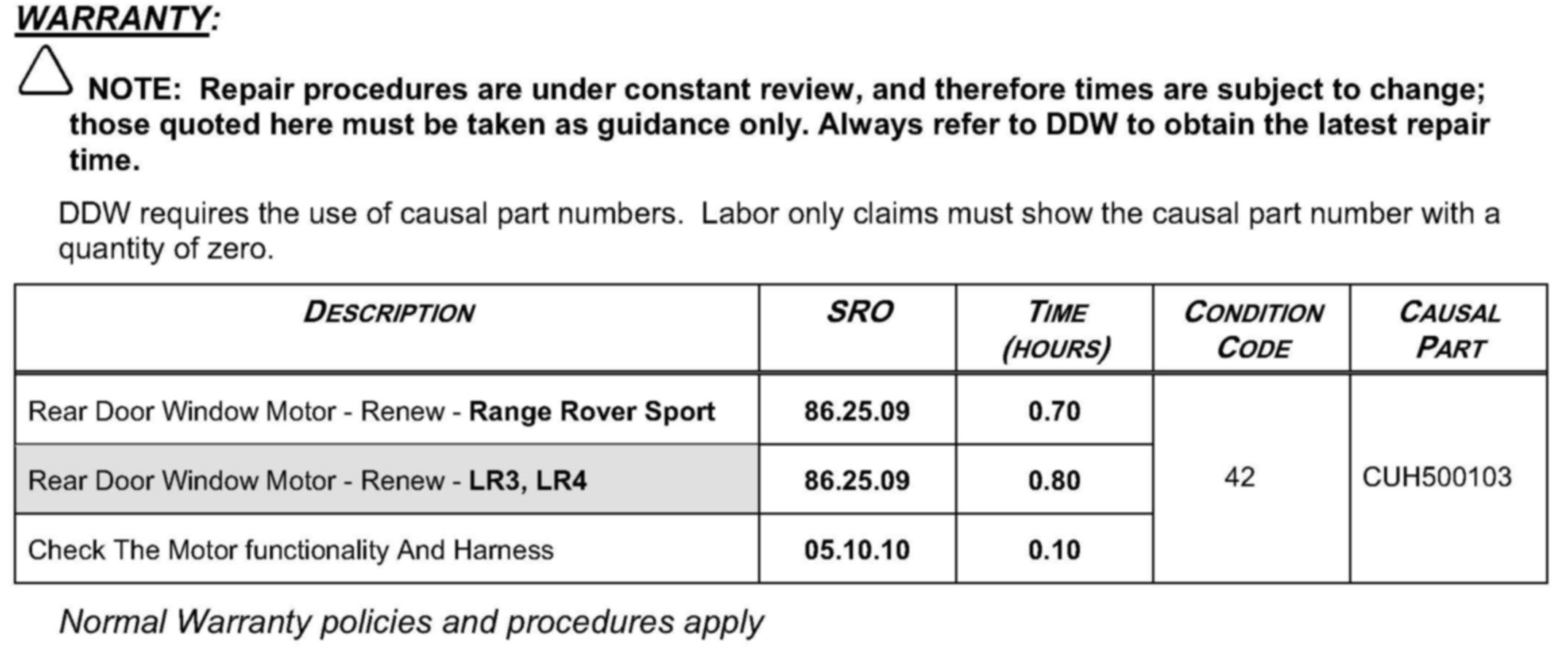Body - Rear Door Window Regulator/Motor Repair
