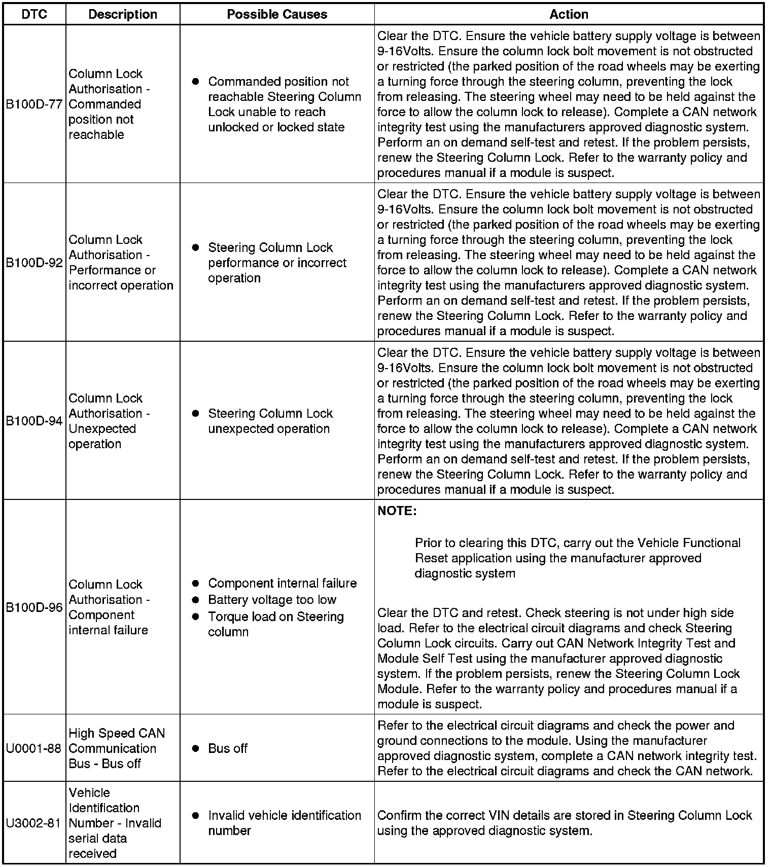 The table below lists all Diagnostic Trouble Codes (DTCs) that could be logged in the Steering Column Lock Module, for additional Diagnosis and Testing information refer to the relevant Diagnosis and Testing Section. For additional information, refer to Anti-Theft - Passive Anti-Theft - Passive