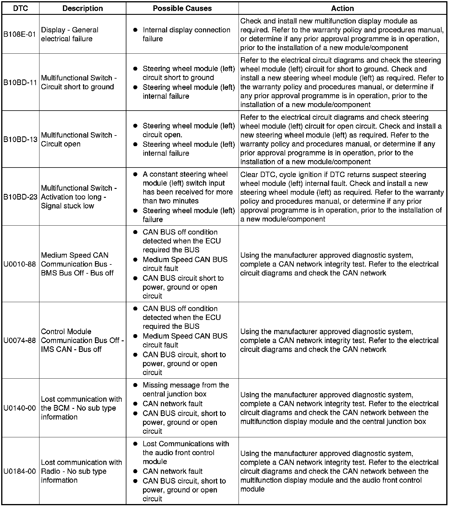 The table below lists all Diagnostic Trouble Codes (DTCs) that could be logged in the Multifunction Display Module, for additional Diagnosis and Testing information refer to the relevant Diagnosis and Testing Section. For additional information, refer to Information and Entertainment System Testing and Inspection