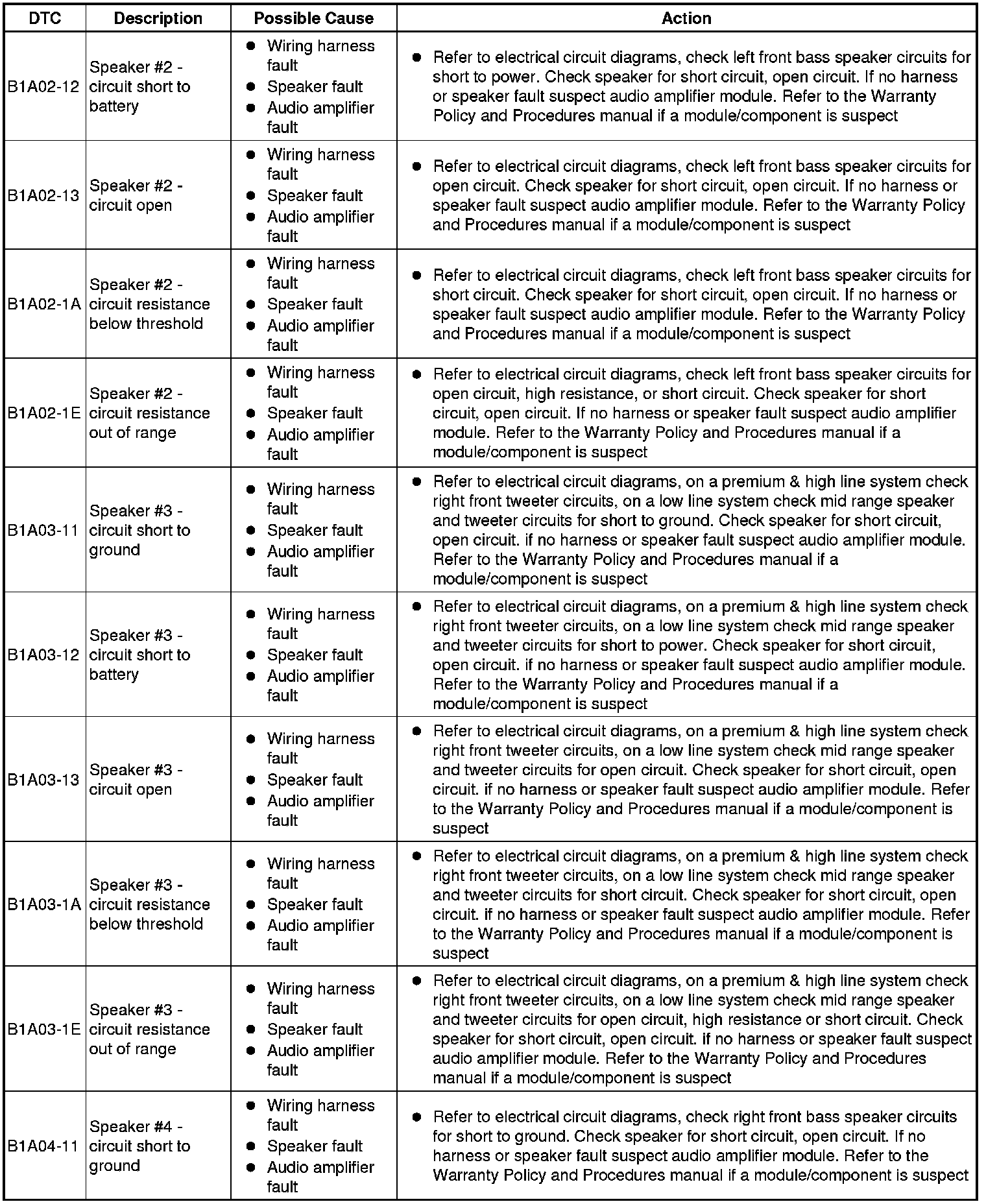 The table below lists all Diagnostic Trouble Codes (DTCs) that could be logged in the Audio Amplifier Module, for additional Diagnosis and Testing information refer to the relevant Diagnosis and Testing Section. For additional information, refer to Information and Entertainment System Testing and Inspection