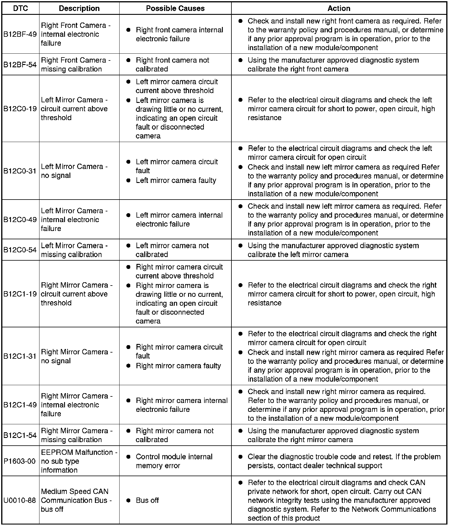 The table below lists all Diagnostic Trouble Codes (DTCs) that could be logged in the Image Processing Module B, for additional Diagnosis and Testing information refer to the relevant Diagnosis and Testing Section. For additional information, refer to Parking Aid Testing and Inspection