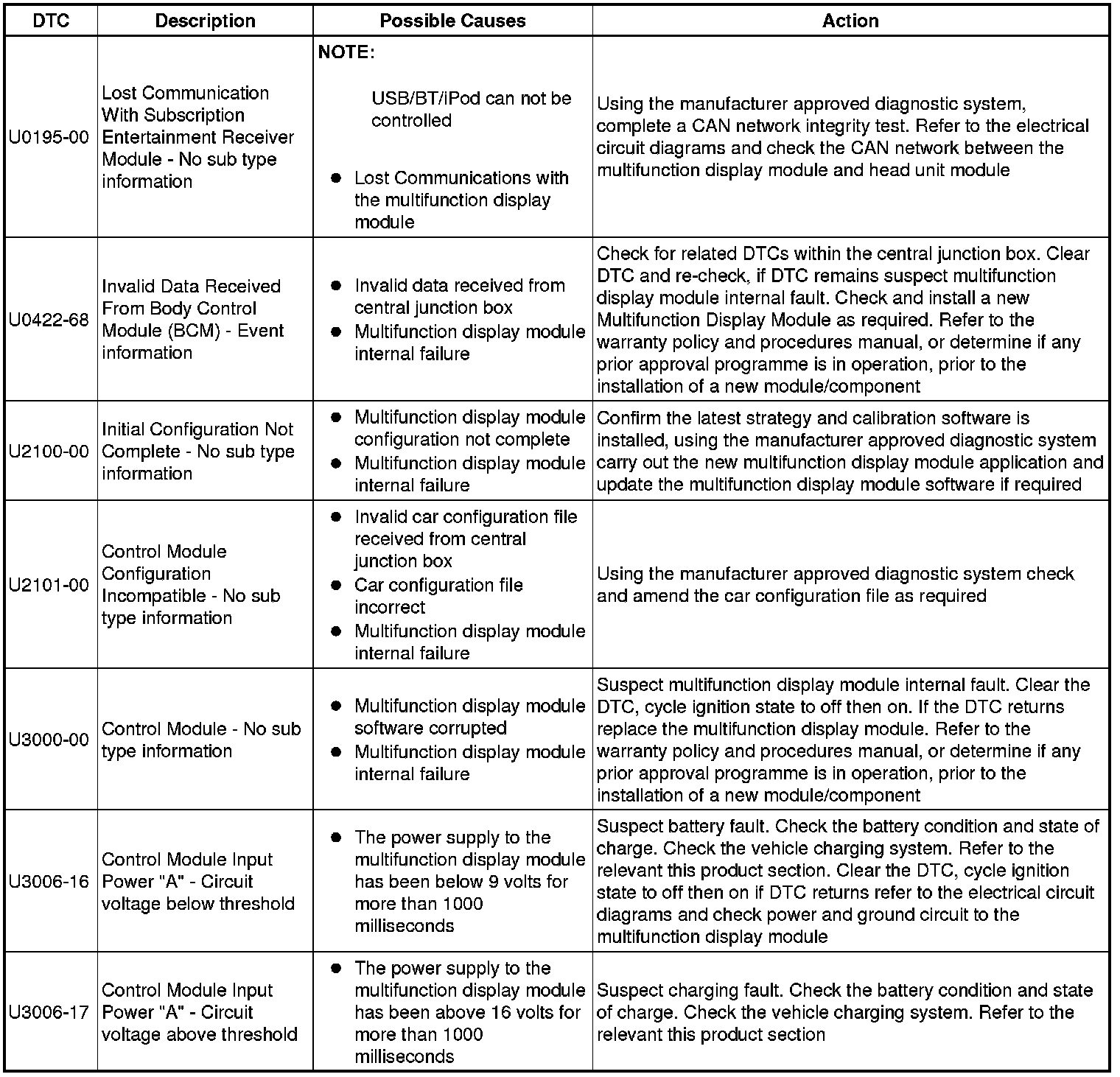 The table below lists all Diagnostic Trouble Codes (DTCs) that could be logged in the Multifunction Display Module, for additional Diagnosis and Testing information refer to the relevant Diagnosis and Testing Section. For additional information, refer to Information and Entertainment System Testing and Inspection