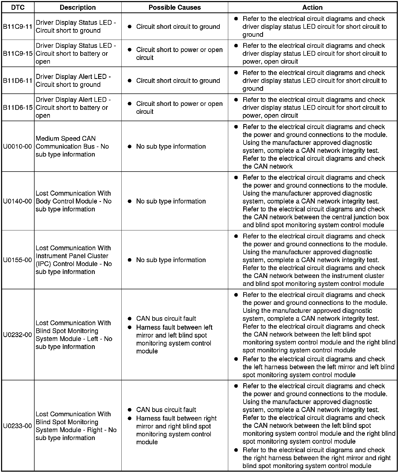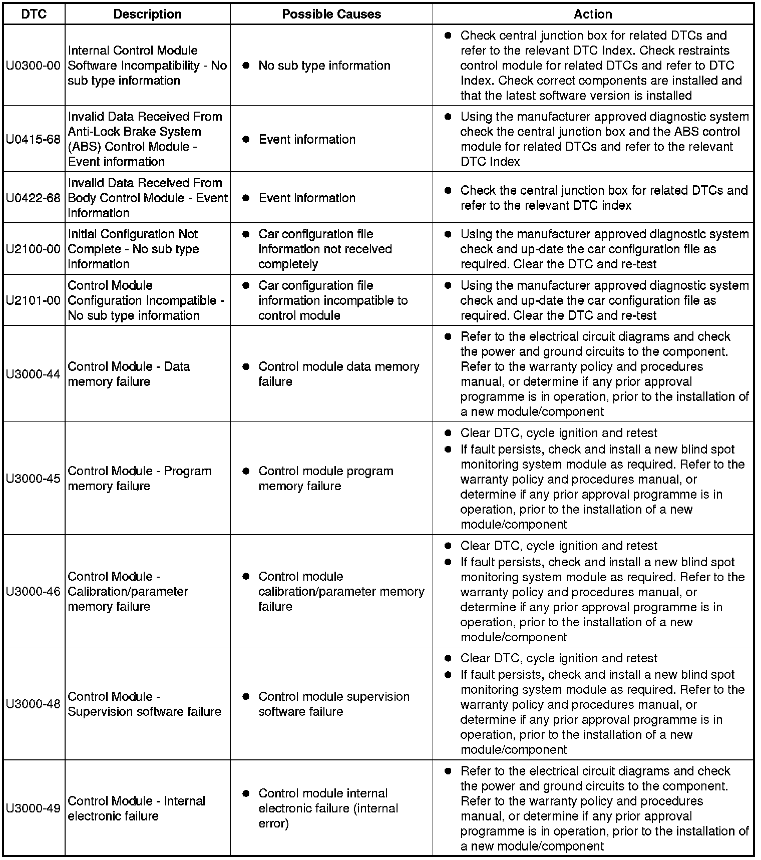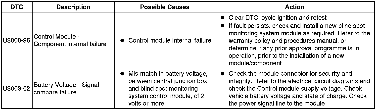 The table below lists all Diagnostic Trouble Codes (DTCs) that could be logged in the Blind Spot Monitoring System Module, for additional Diagnosis and Testing information refer to the relevant Diagnosis and Testing Section. For additional information, refer to Warning Devices Testing and Inspection