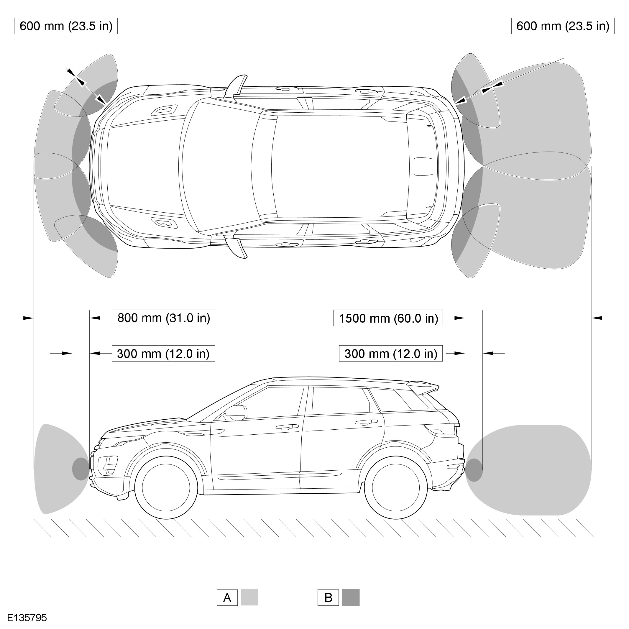 The maximum detection range for the rear sensors is 1500 mm (60 inches) for the central sensors and 600 mm (23.5 inches).