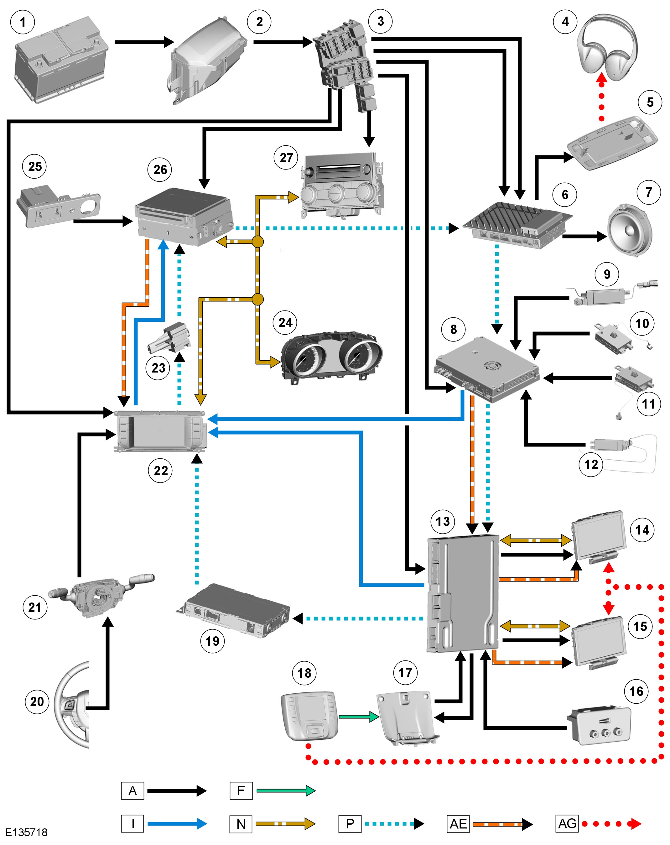 A = Hardwired; F = RF transmission; I = CVBS; N = Medium Speed CAN (controller area network) bus; P = MOST; AE = LVDS; AG = Infra Red