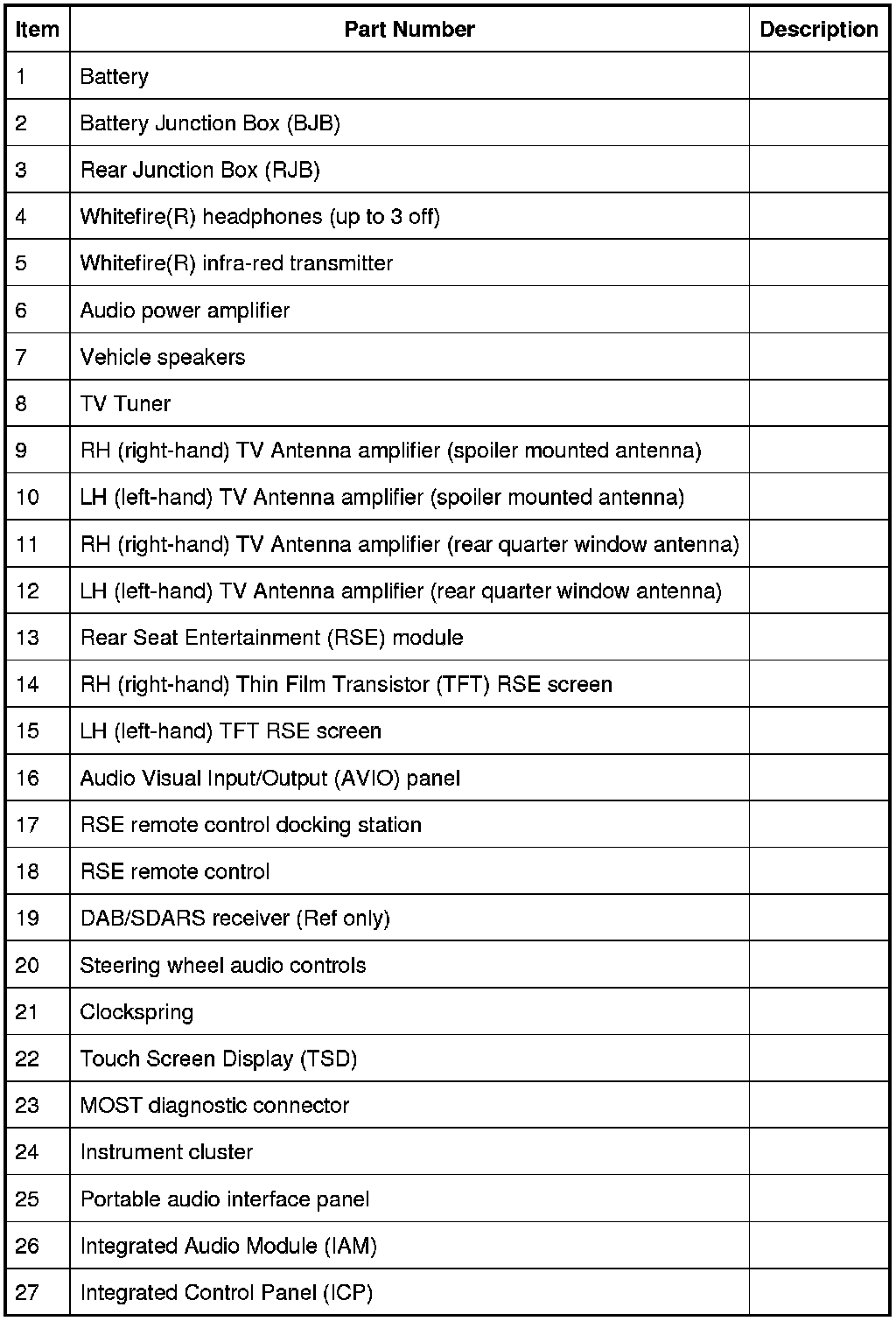 The TV tuner is located under LH (left-hand) front seat, next to the audio power amplifier. The front seat occupants can view the TV transmissions on the TSD but only if dual view TSD is installed or the vehicle is stationary on a non dual-view TSD. When the RSE system is fitted, the TV tuner allows the rear seat occupants to view television transmissions on the RSE screens.