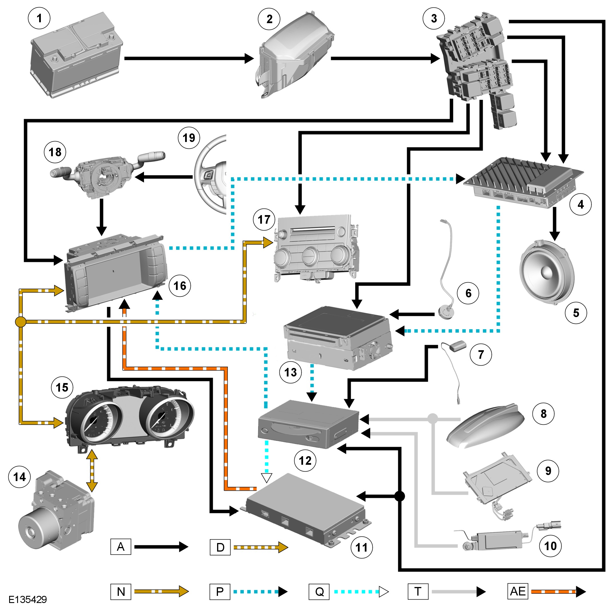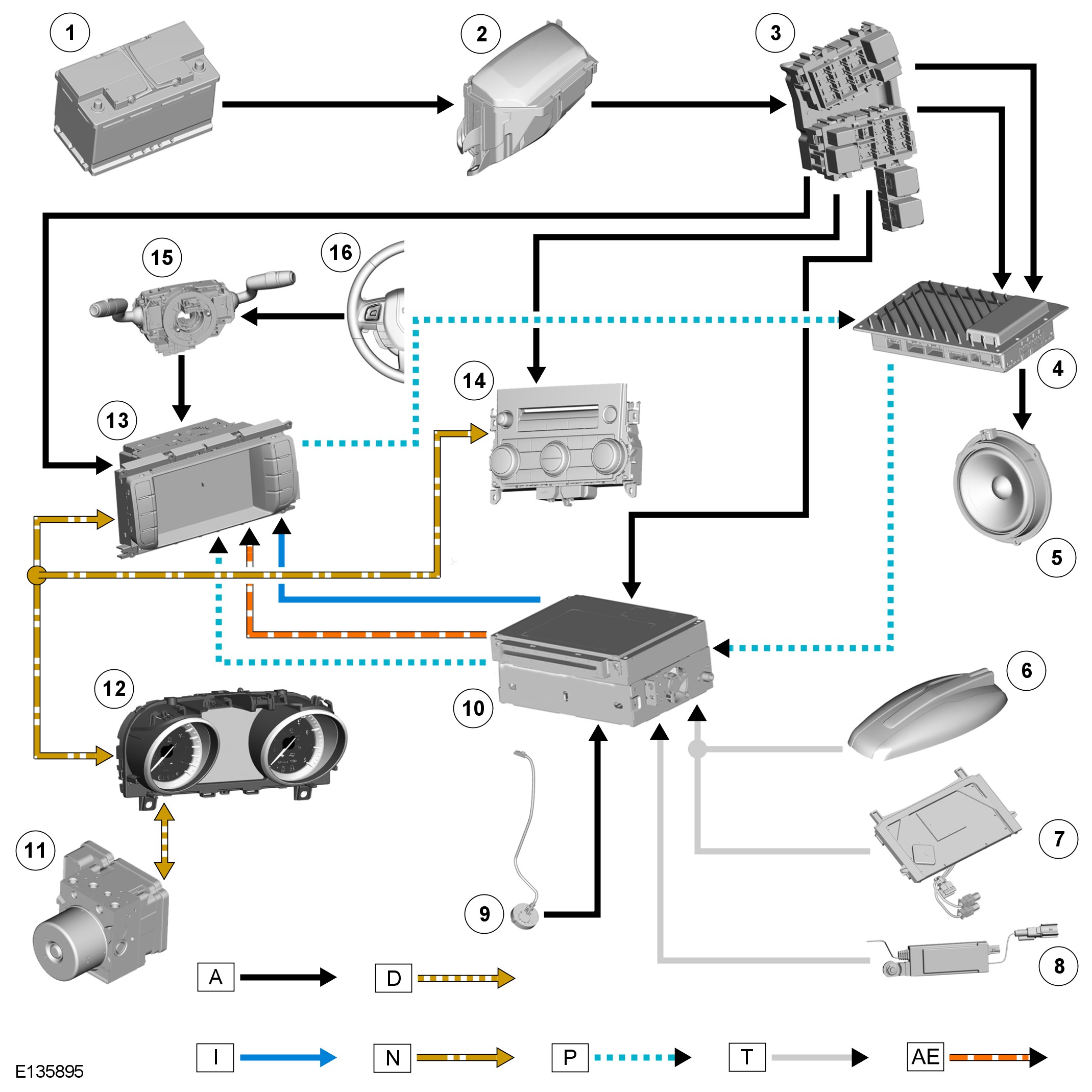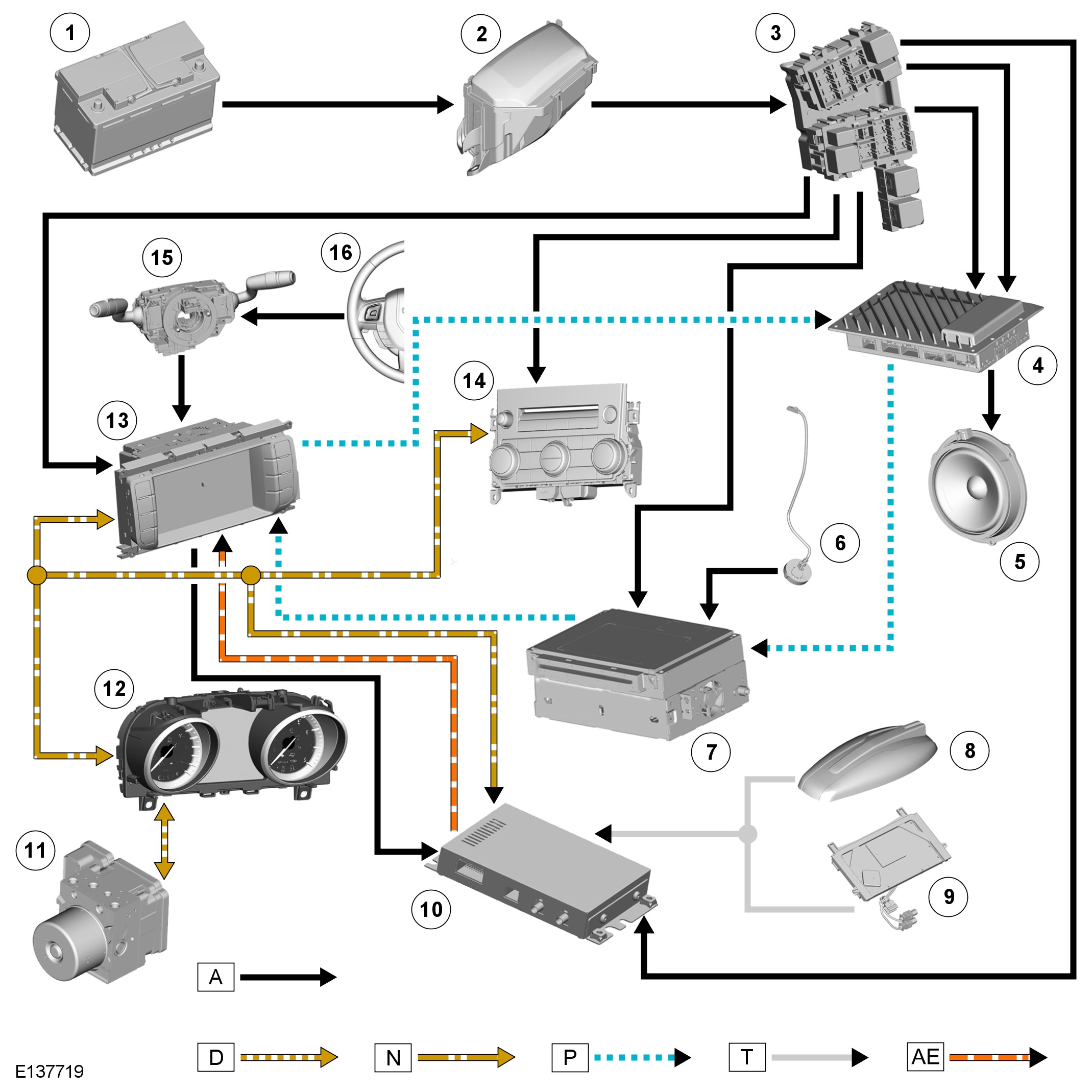 On Asia vehicles, if voice guidance is operational, the voice signal information is relayed from the navigation computer, via an analogue audio signal to the IAM. The IAM converts the analogue signals which are then passed to the audio power amplifier on the MOST ring for output on the speaker system.