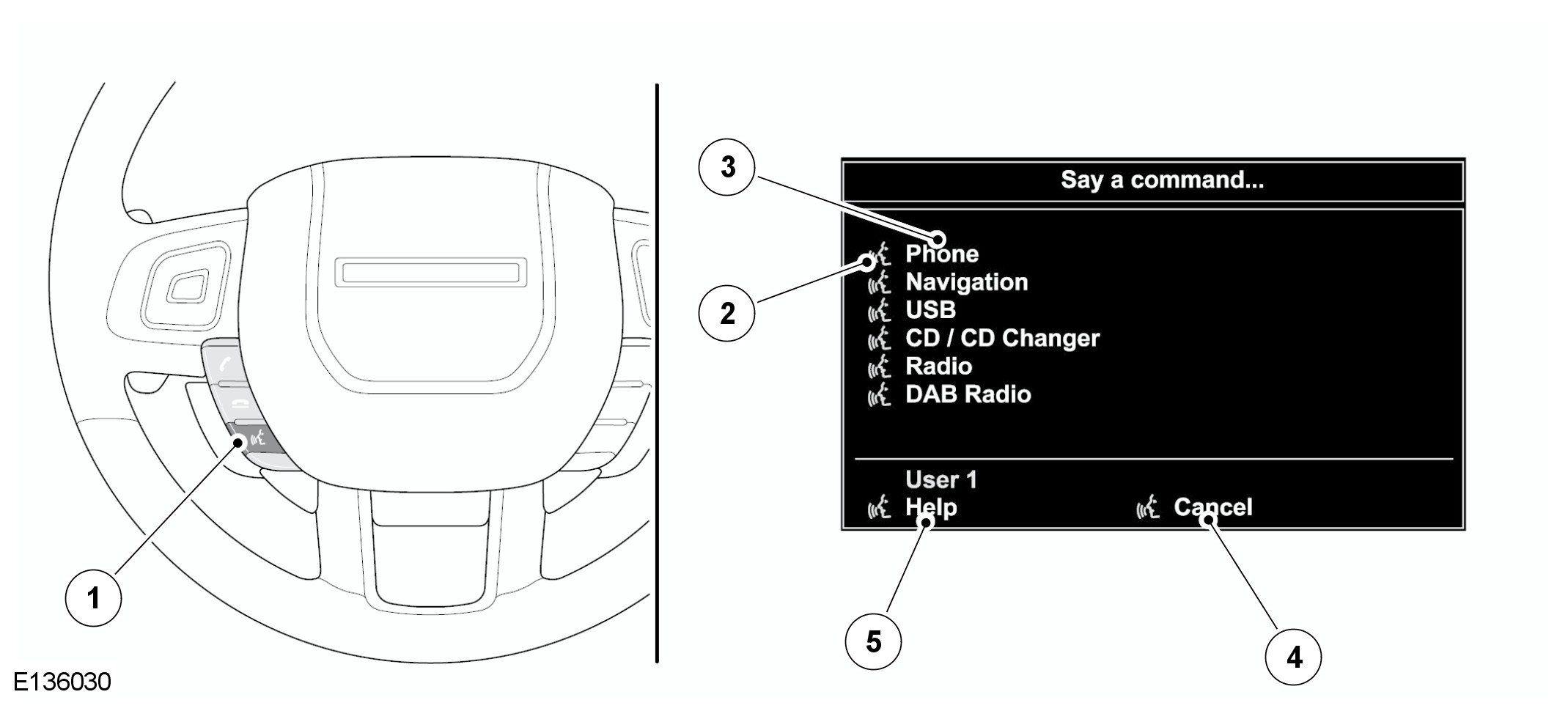 The system is controlled by the voice button on the LH (left-hand) side of the steering wheel. Voice commands are picked up by a dedicated microphone. When giving a voice command, audible feedback will be heard through the vehicle's audio speakers.