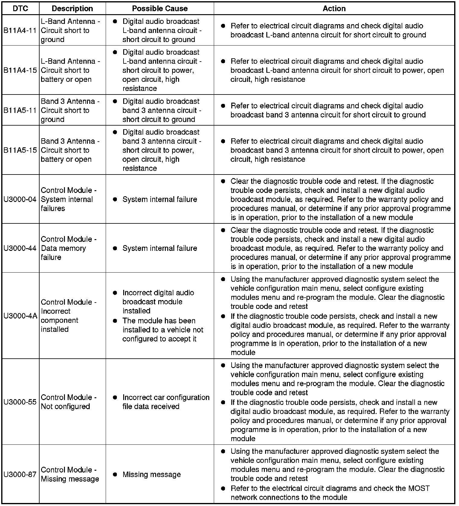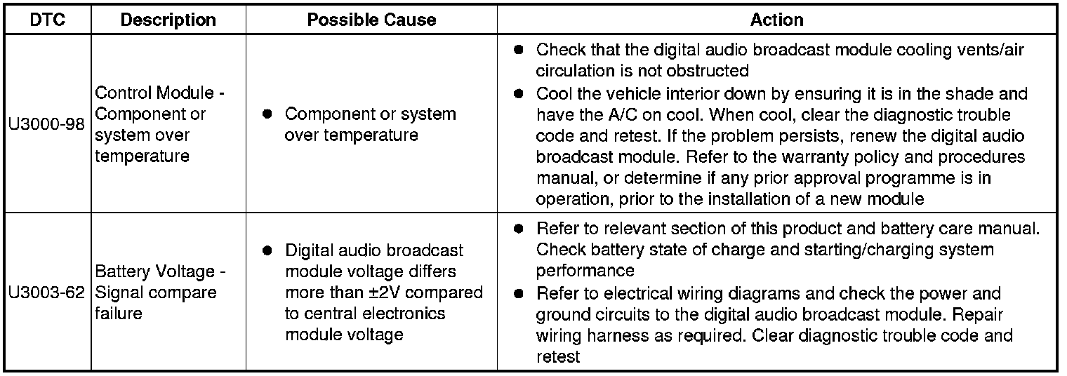 The table below lists all diagnostic trouble codes (DTCs) that could be logged on the digital audio broadcast module, for additional information refer to the relevant Description and Operation section. For additional information, refer to Audio System Component Locations