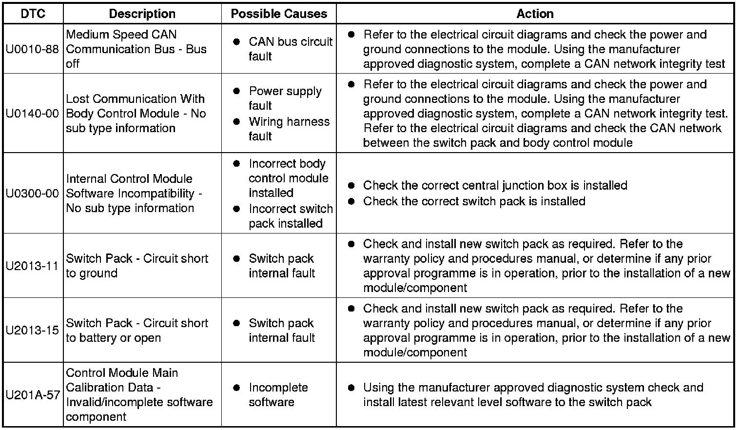 The table below lists all Diagnostic Trouble Codes (DTCs) that could be logged in the Front Control Interface Module B, for additional Diagnosis and Testing information refer to the relevant Diagnosis and Testing Section. For additional information, refer to Information and Entertainment System Testing and Inspection