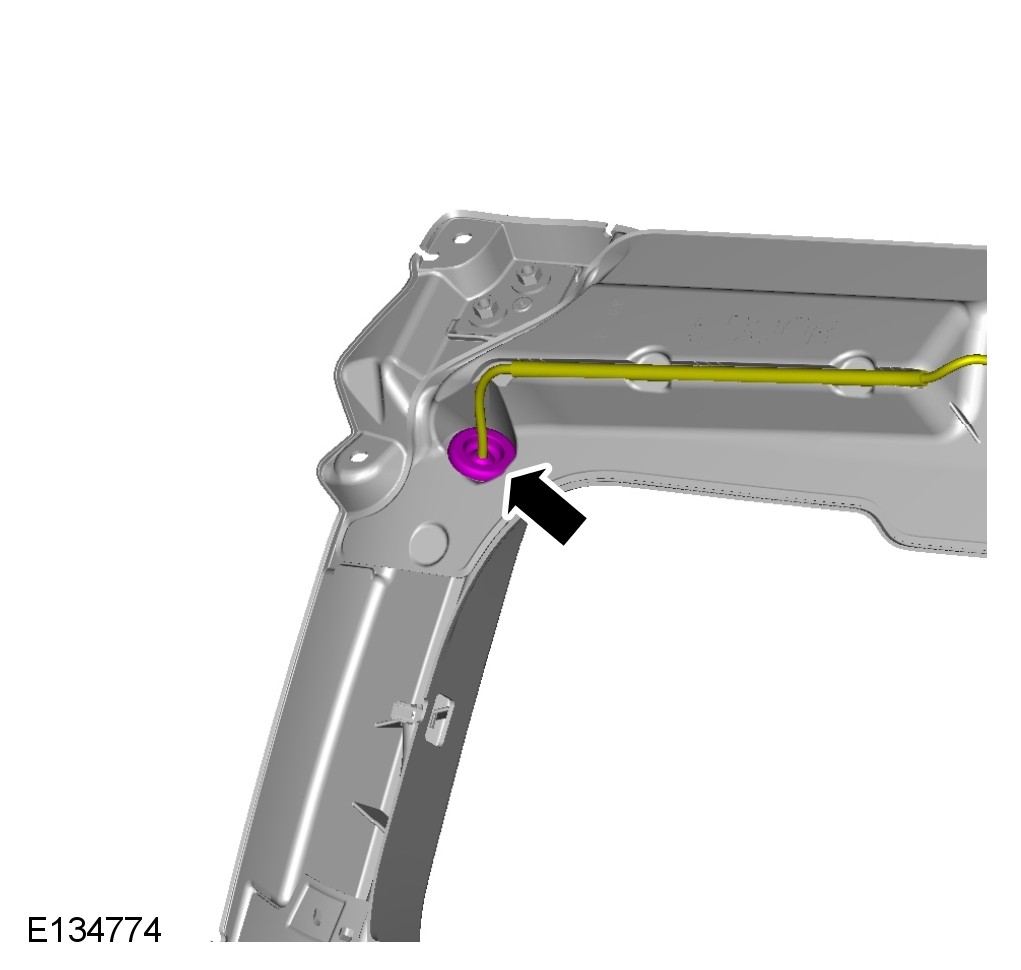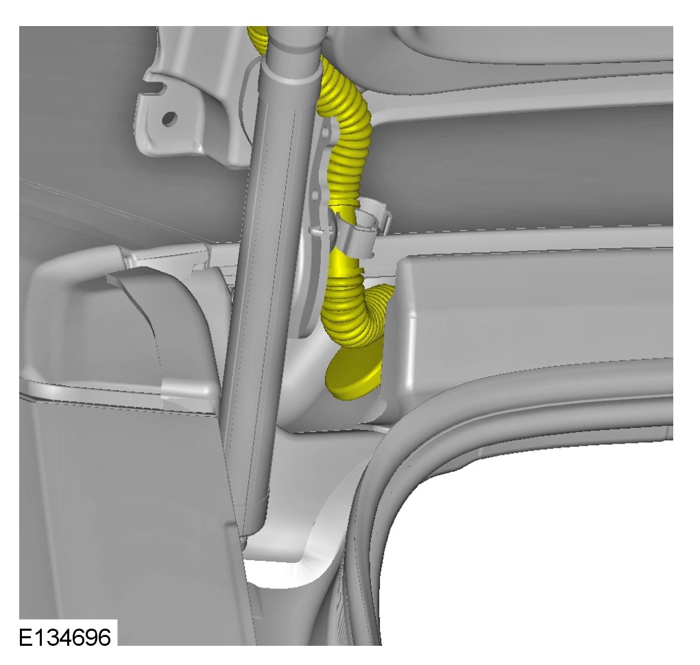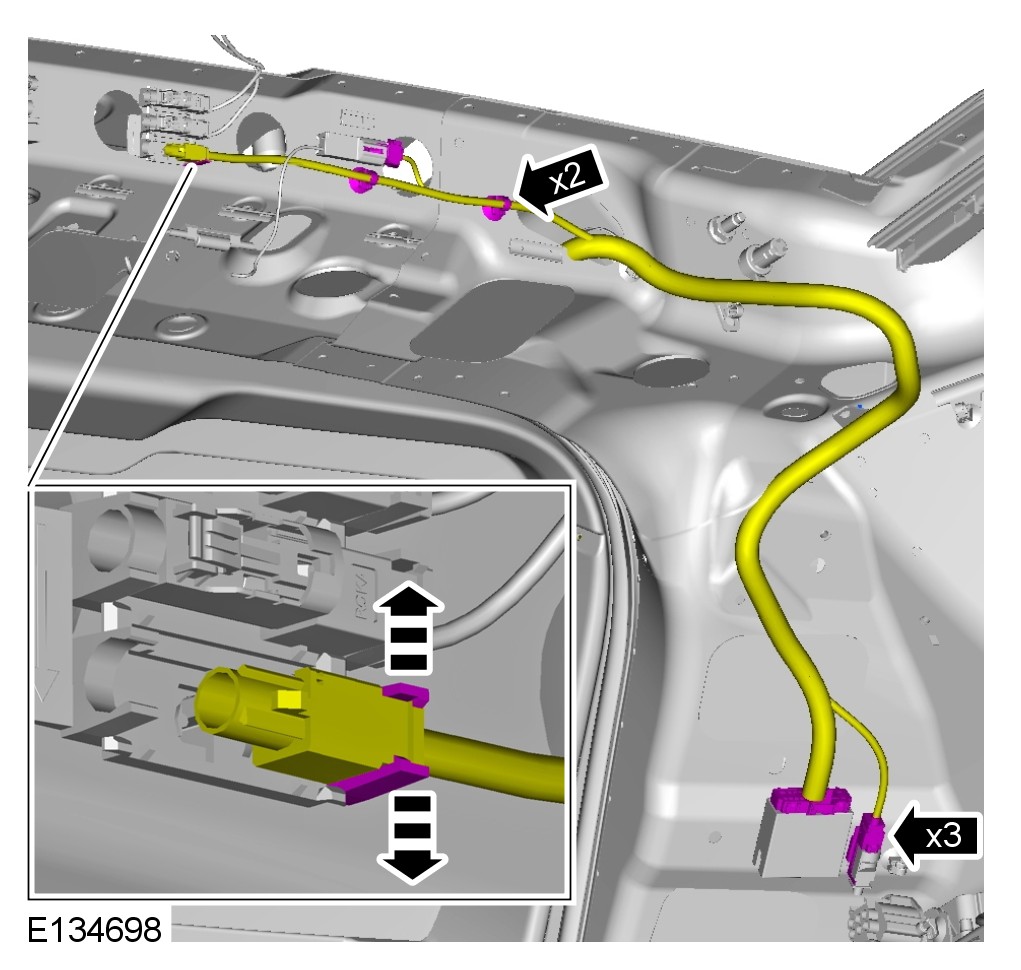 CAUTION: The headliner must be lowered as a complete unit to gain access to the electrical connections. Partial lowering of the headliner may cause damage.
