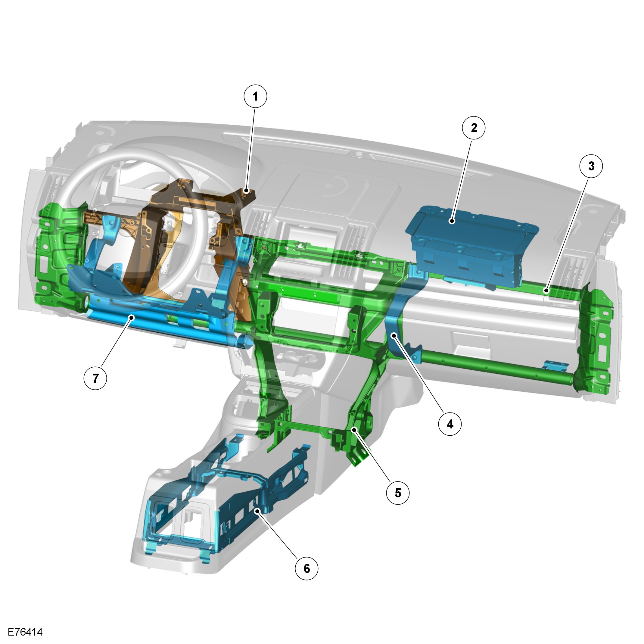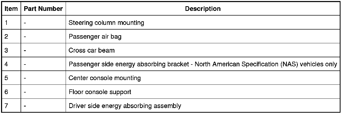 Secured to the center of the cross car beam is a cast magnesium structure which provides support and mounting points for the center console. Mounted on the driver side of the cross car beam is the steering column support, which is also manufactured from magnesium. The cross car beam also provides a mounting point for the dual stage passenger air bag. For additional information, refer to Air Bag Systems