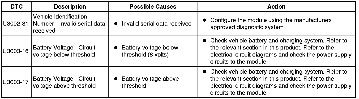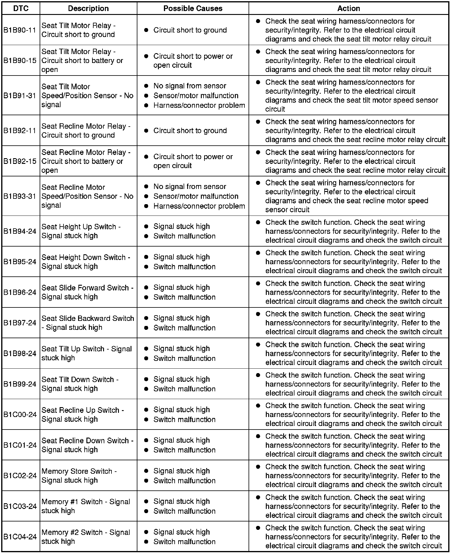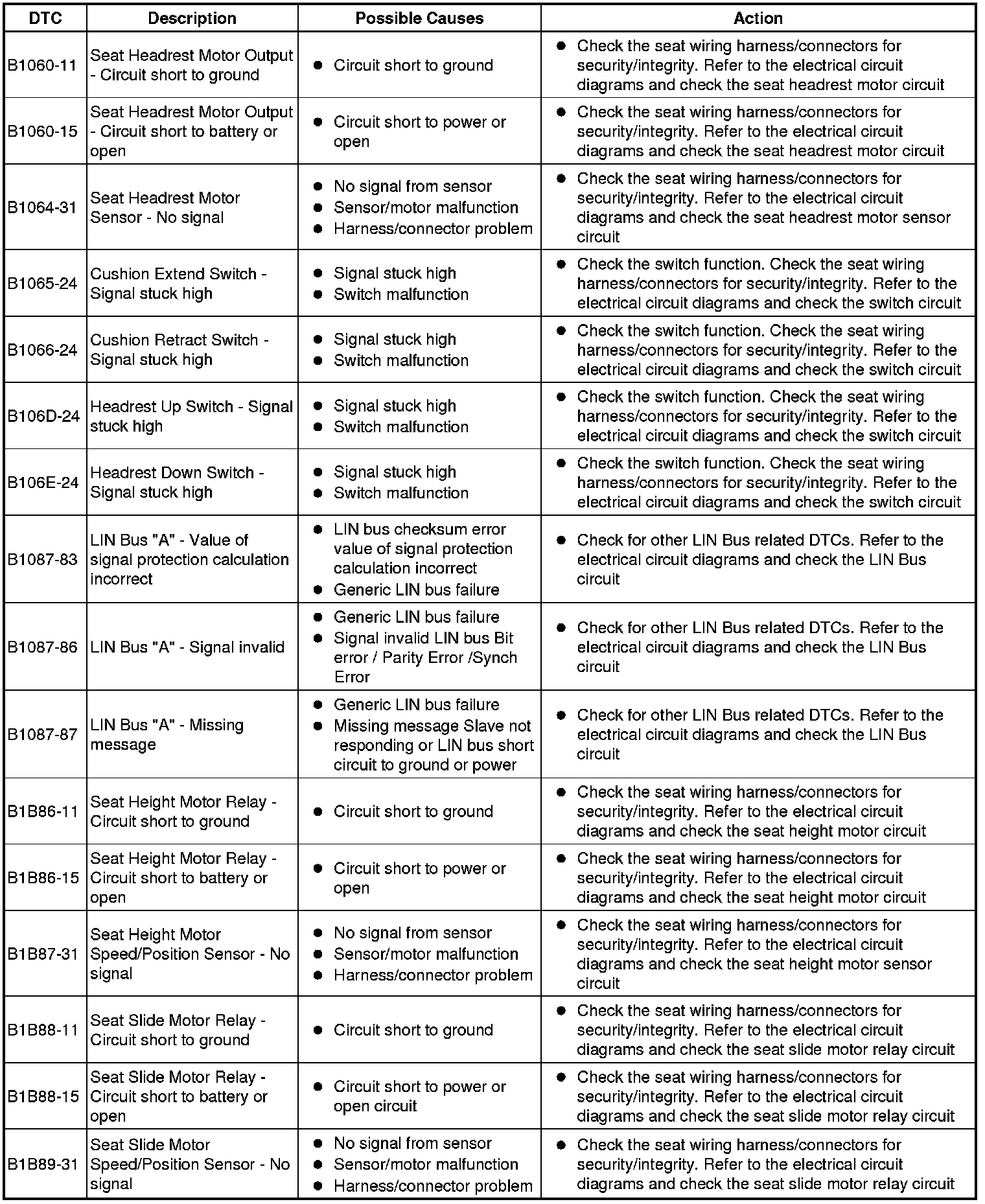 The table below lists all Diagnostic Trouble Codes (DTCs) that could be logged in the Driver/Passenger Seat Module, for additional Diagnosis and Testing information refer to the relevant Diagnosis and Testing Section. For additional information, refer to Seats Testing and Inspection