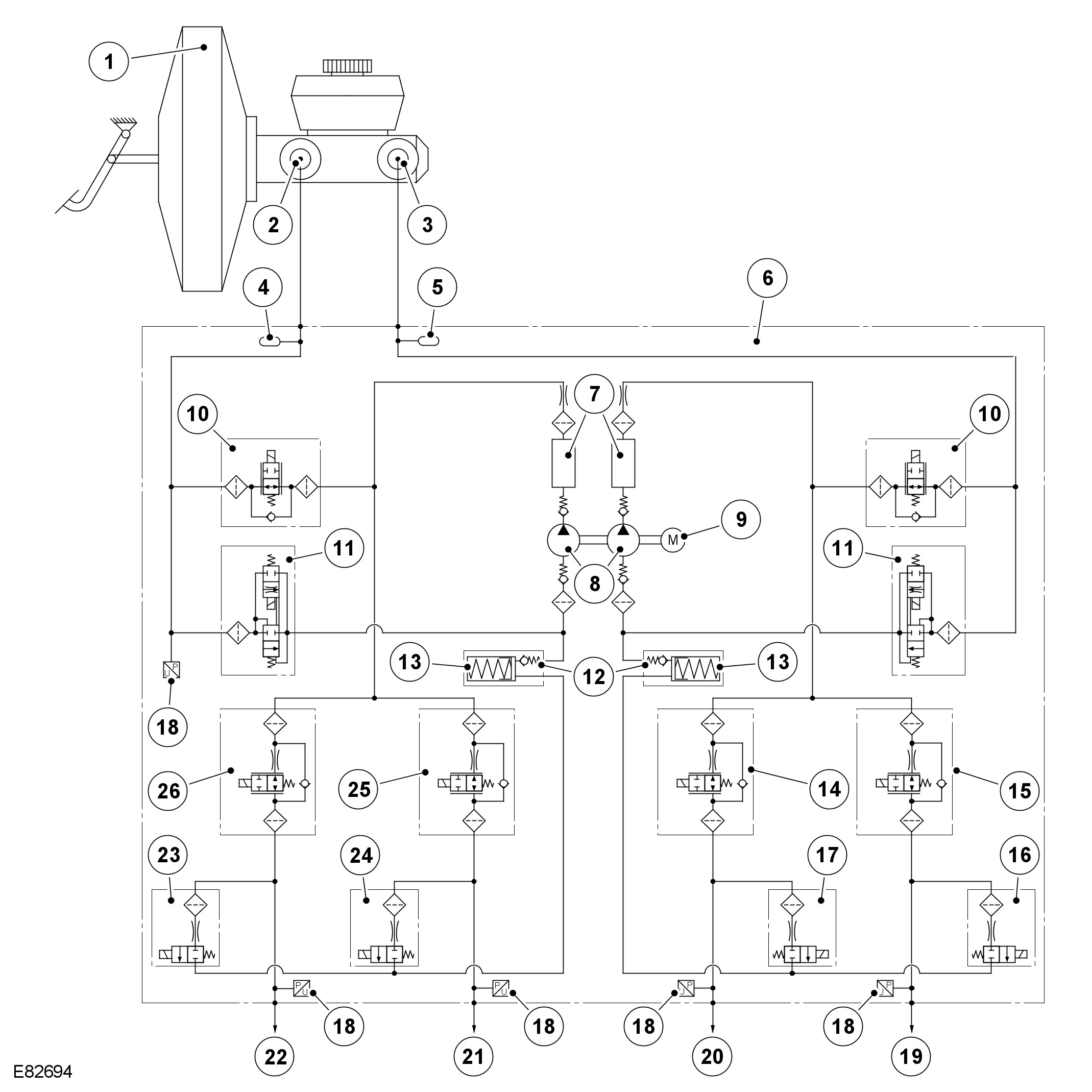 - Normally open, solenoid-operated inlet valves and normally closed, solenoid-operated outlet valves, to modulate the hydraulic pressure in the individual brakes.