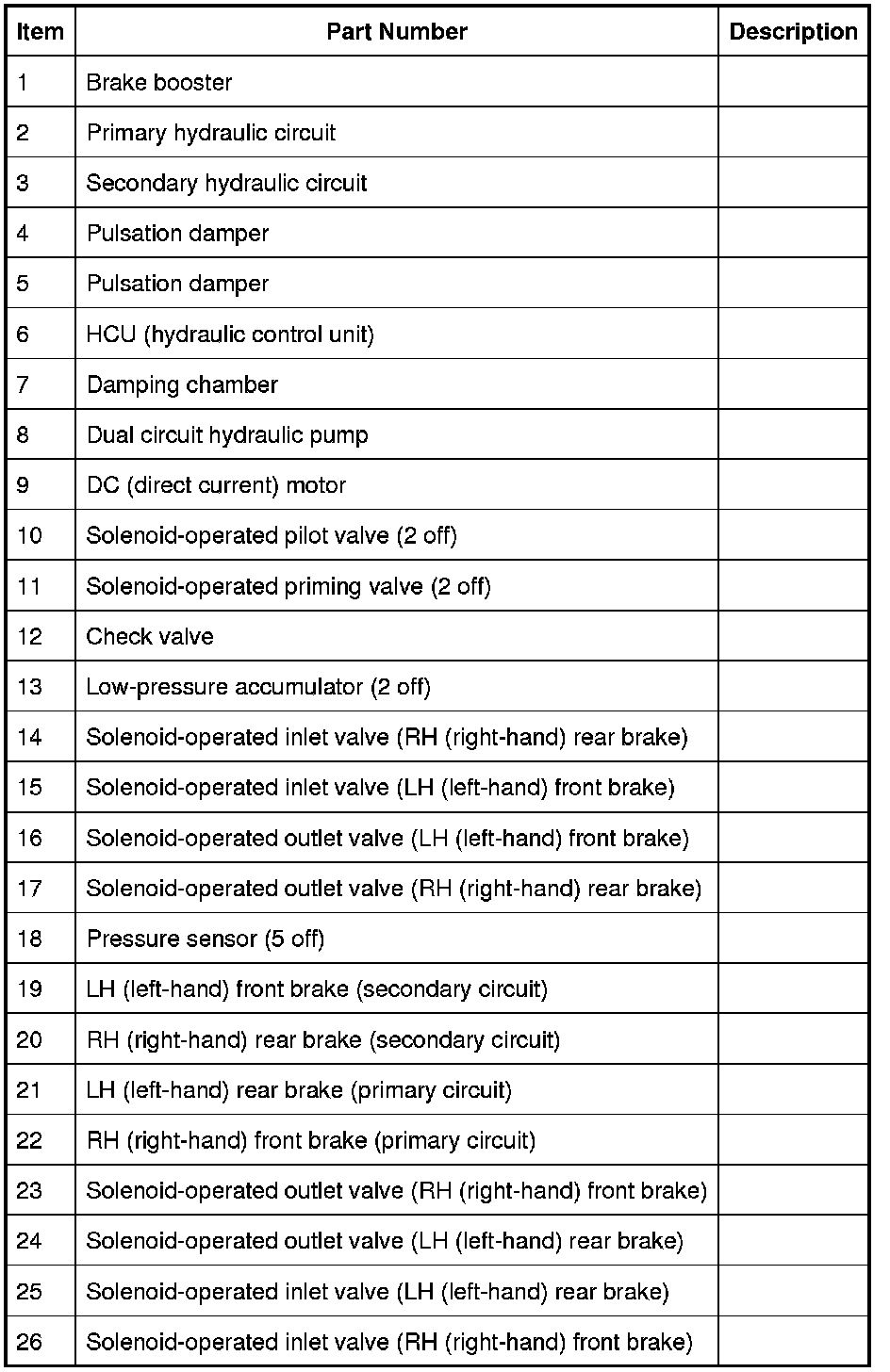 Each of the HCU (hydraulic control unit) circuits contains the following components to control the supply of hydraulic pressure to the brakes: