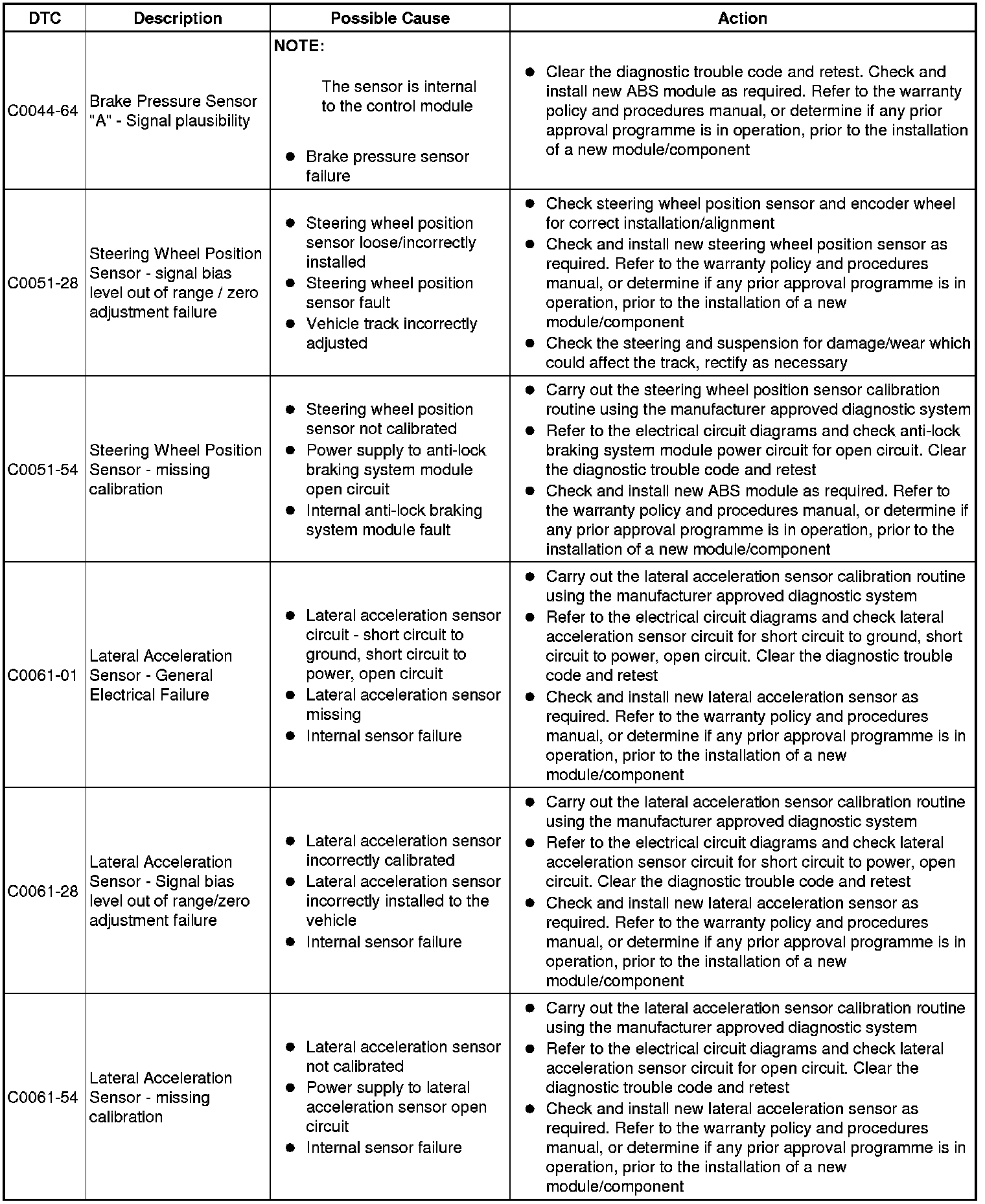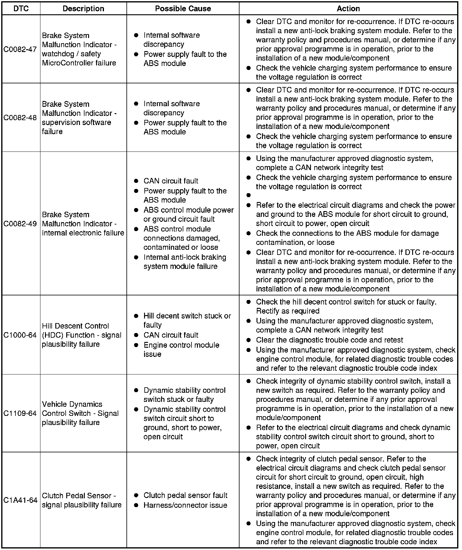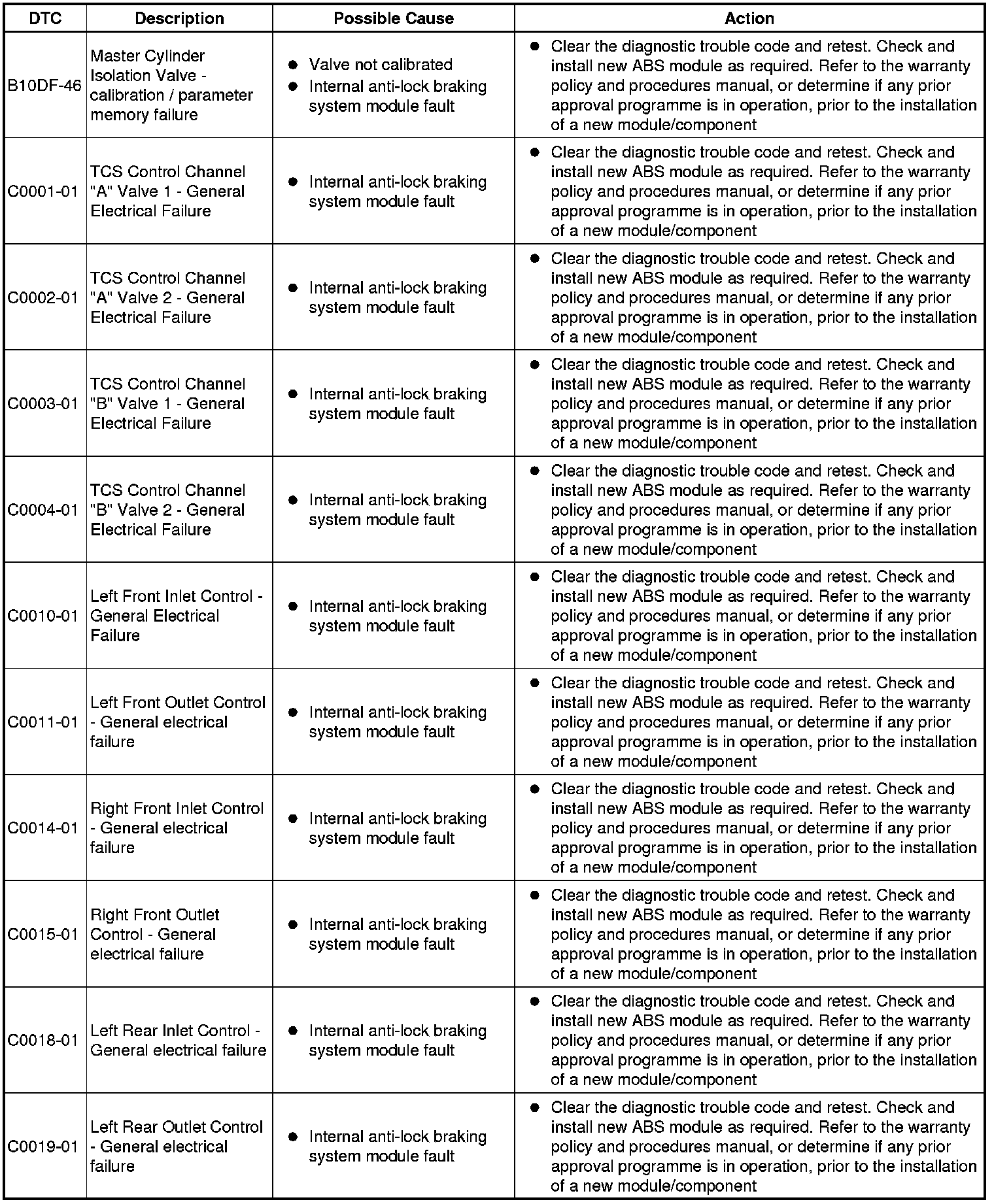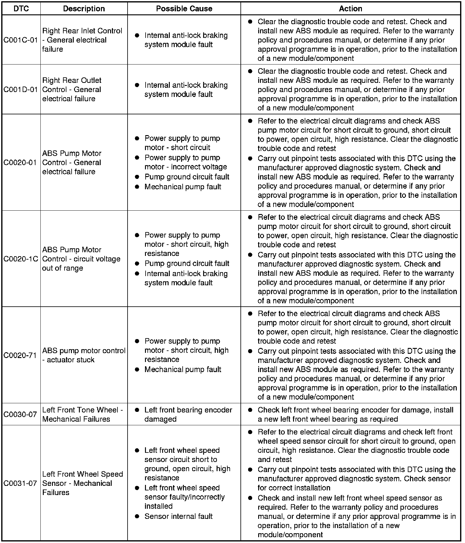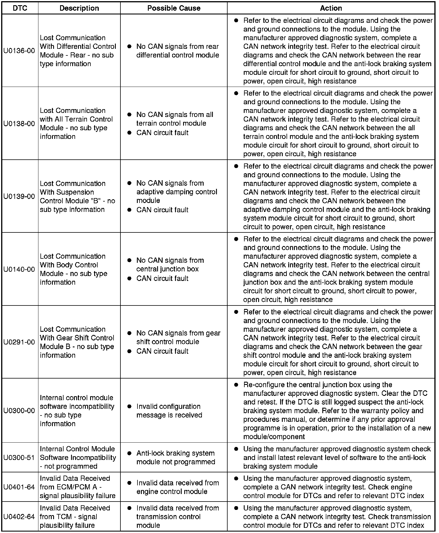 The table below lists all Diagnostic Trouble Codes (DTCs) that could be logged in the anti-lock braking control module, for additional Diagnosis and Testing information refer to the relevant Diagnosis and Testing Section. For additional information, refer to Anti-Lock Control - Traction Control Testing and Inspection