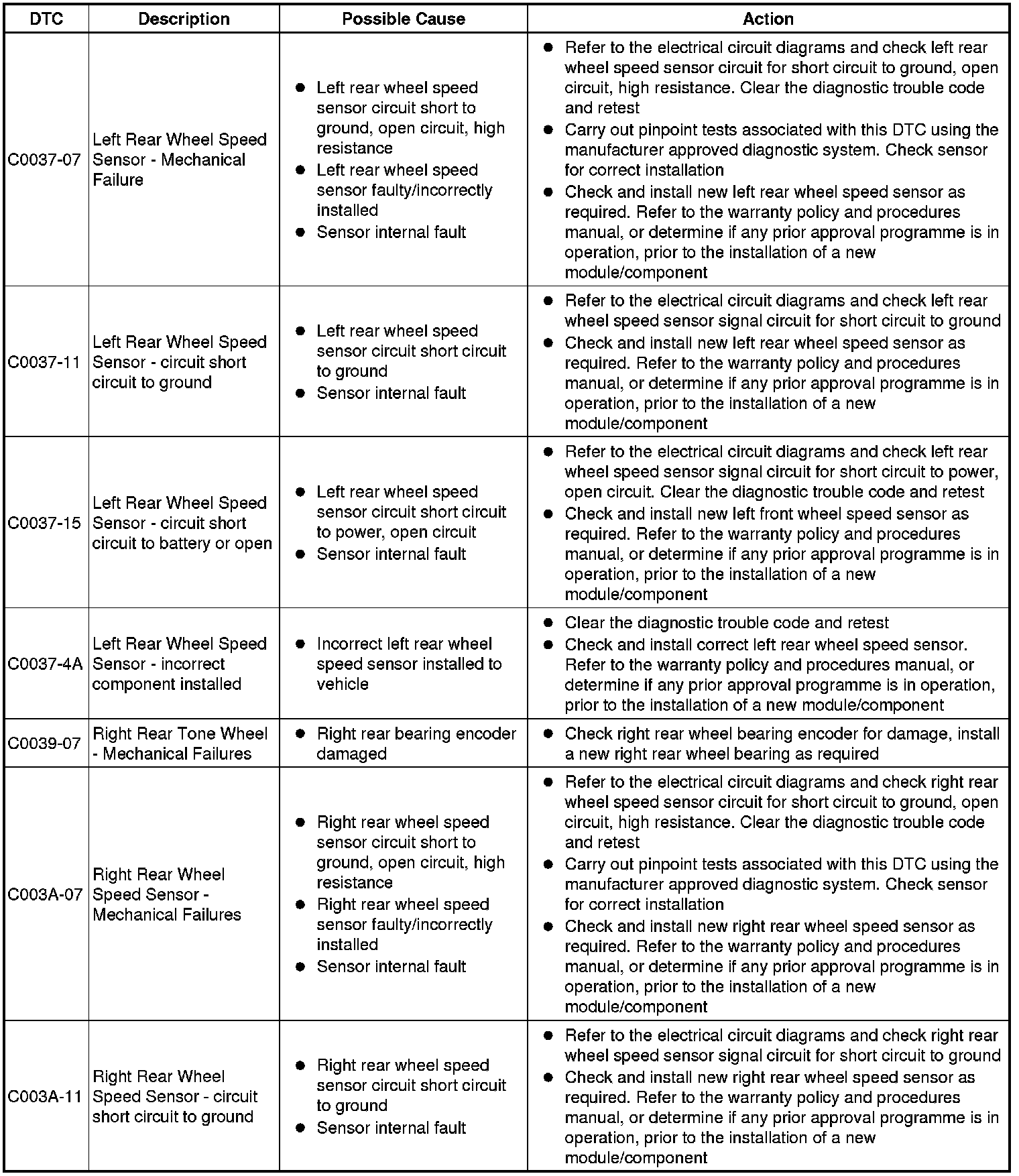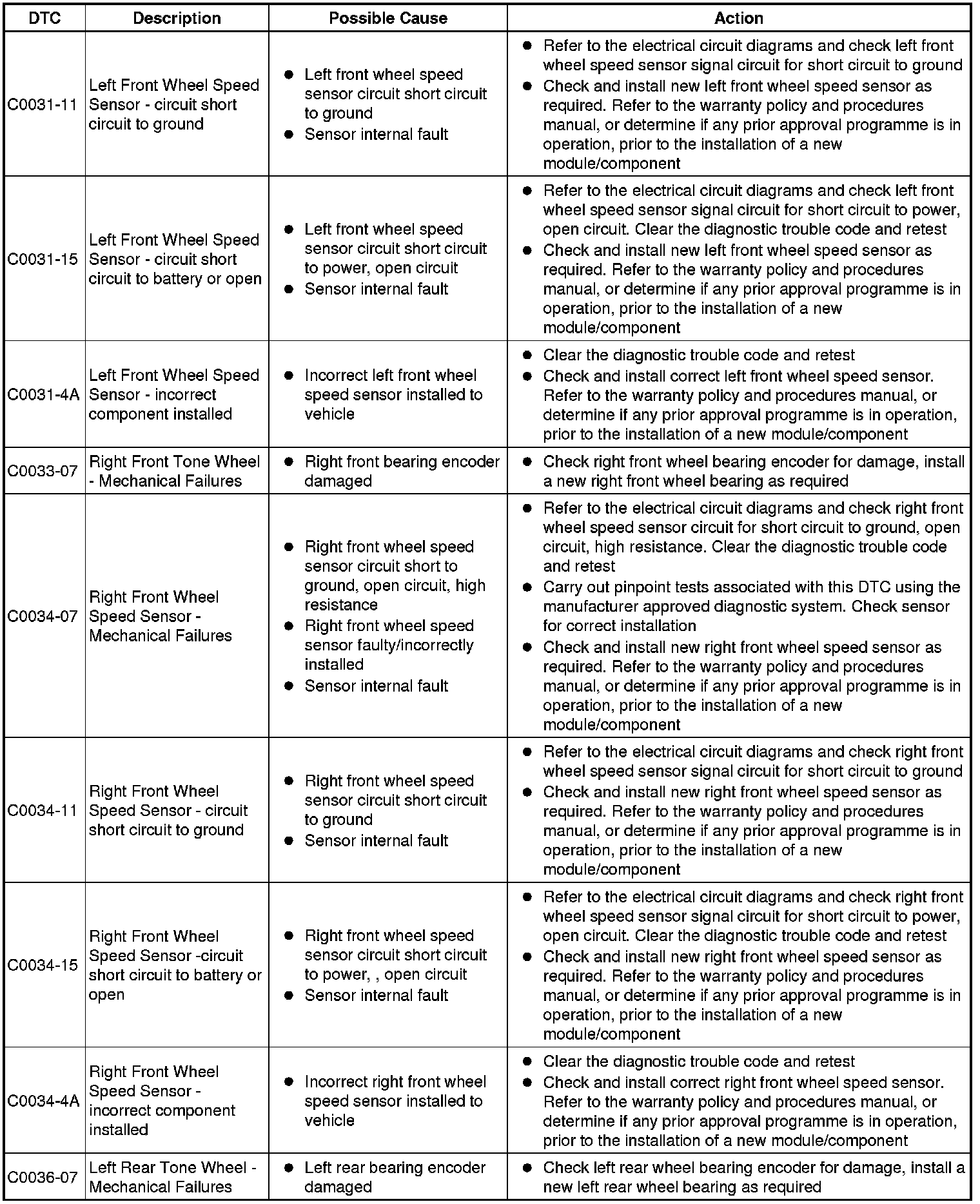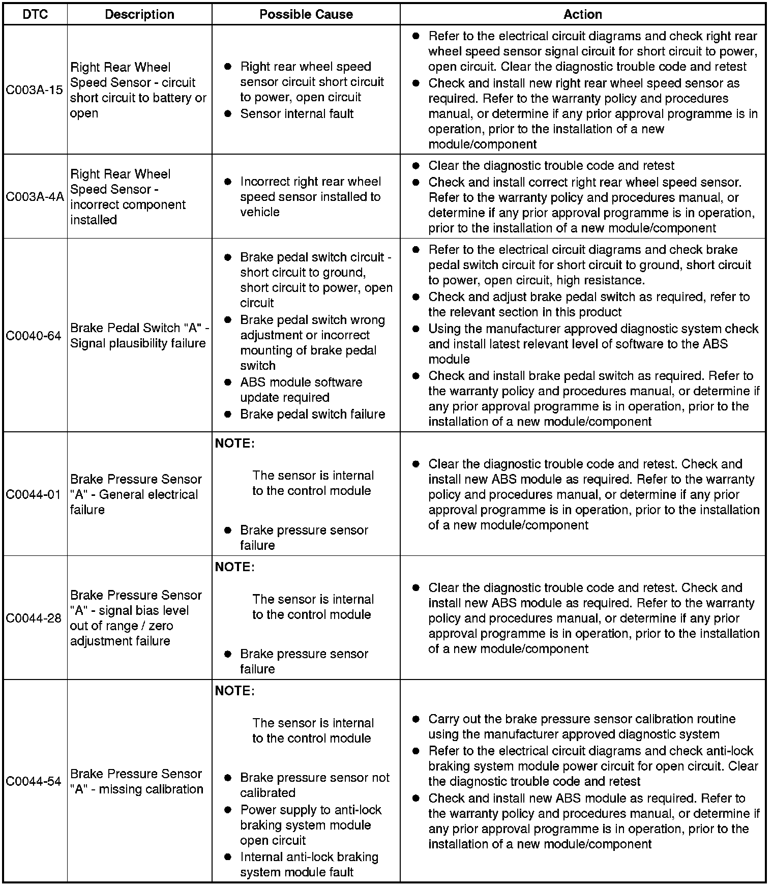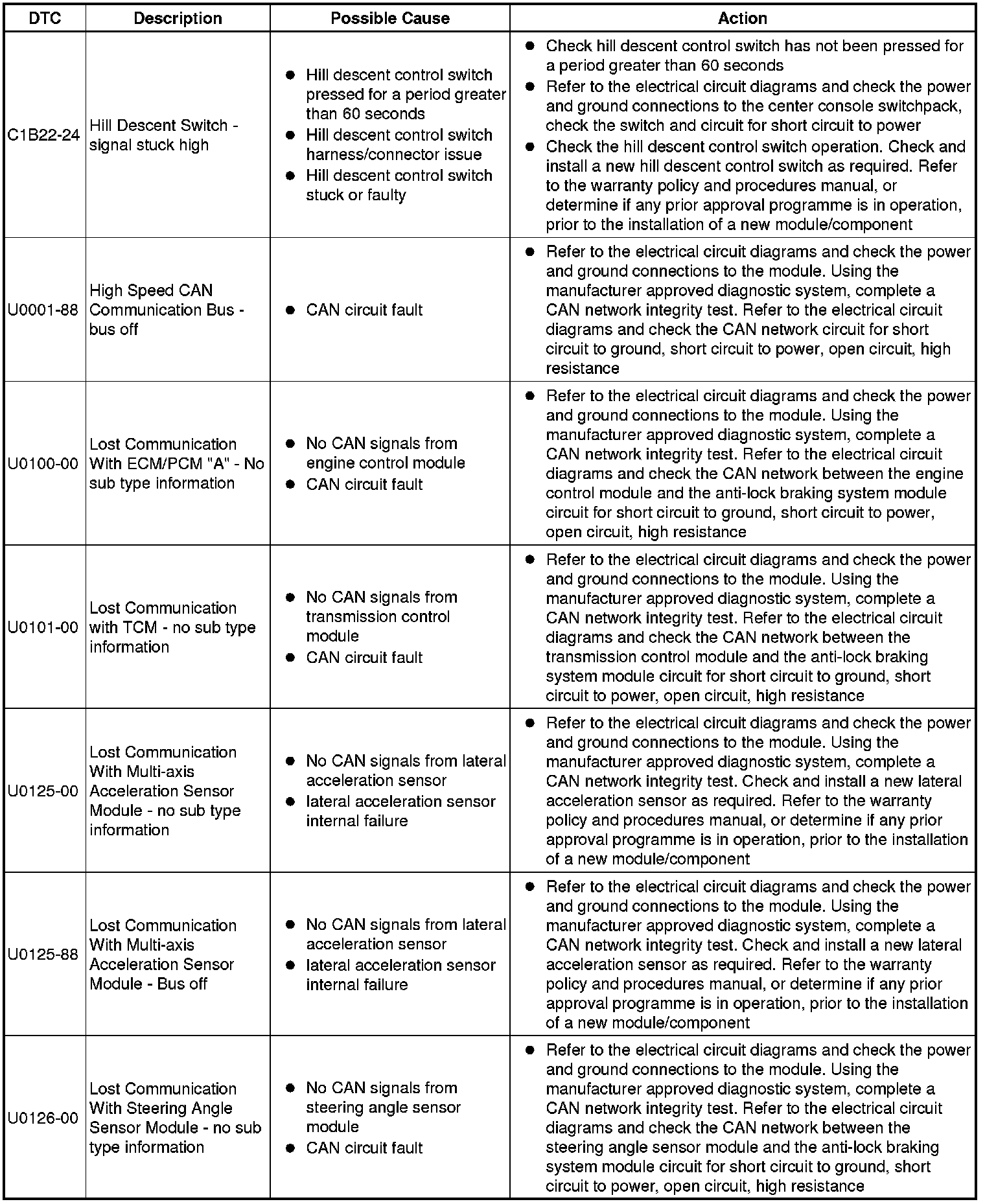 The table below lists all Diagnostic Trouble Codes (DTCs) that could be logged in the anti-lock braking control module, for additional Diagnosis and Testing information refer to the relevant Diagnosis and Testing Section. For additional information, refer to Anti-Lock Control - Traction Control Testing and Inspection