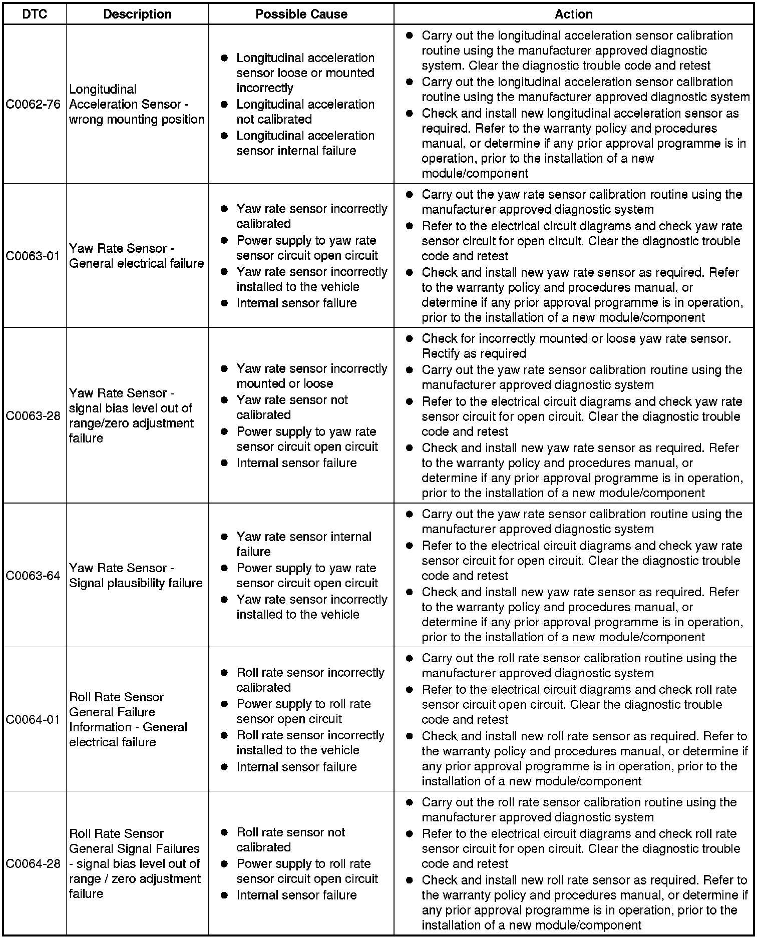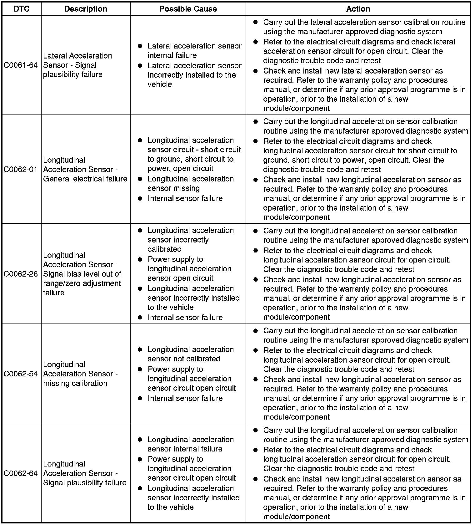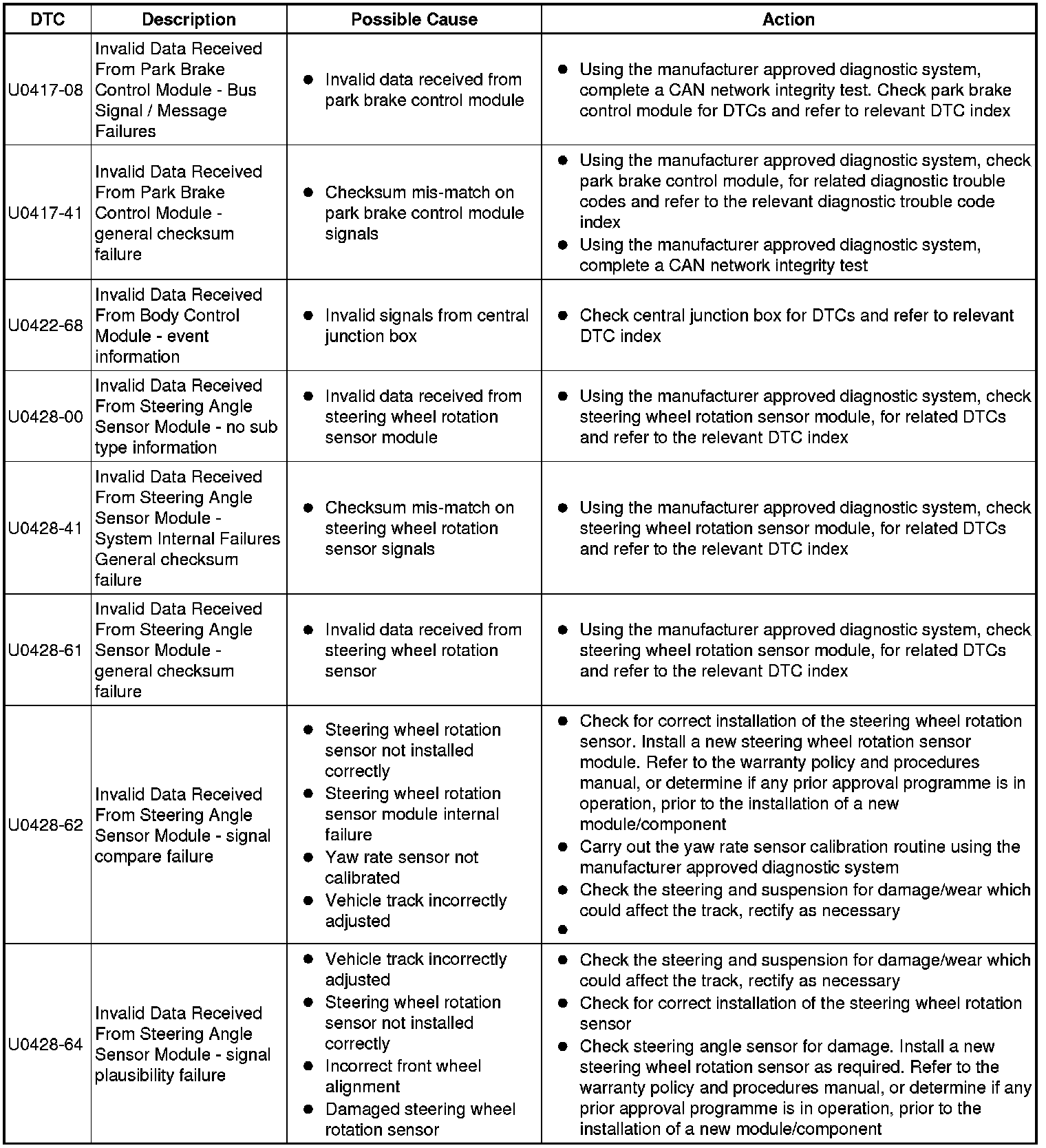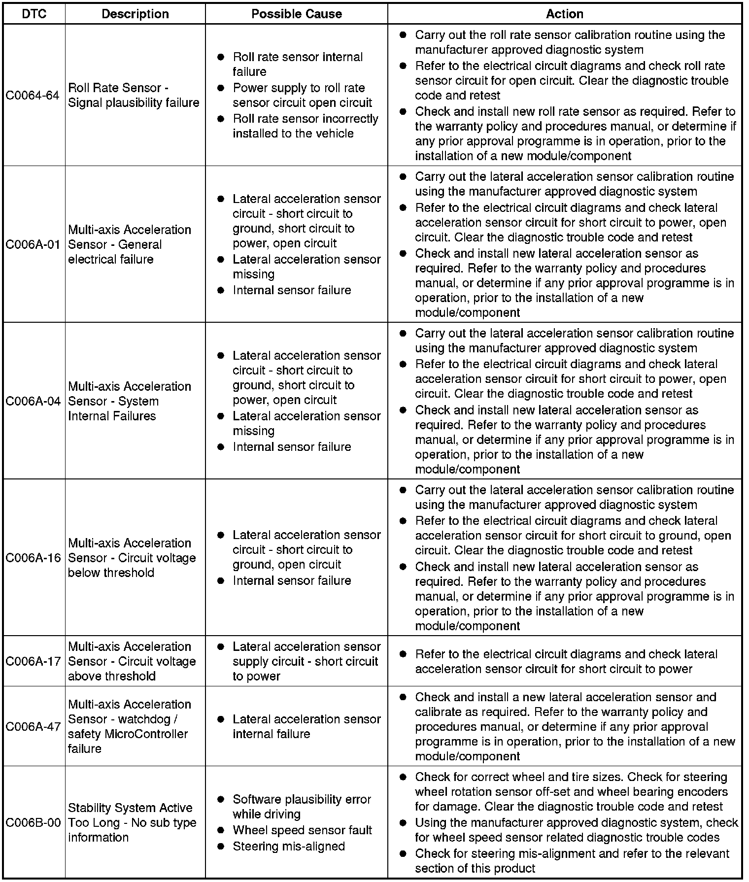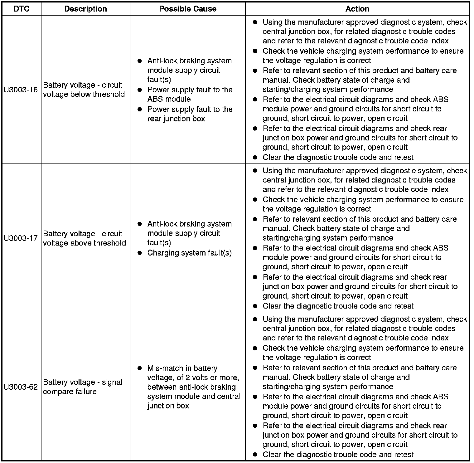 The table below lists all Diagnostic Trouble Codes (DTCs) that could be logged in the anti-lock braking control module, for additional Diagnosis and Testing information refer to the relevant Diagnosis and Testing Section. For additional information, refer to Anti-Lock Control - Traction Control Testing and Inspection