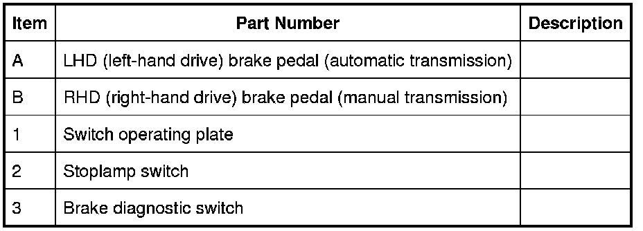 The stoplamp switch and the brake diagnostic switch are mounted on the brake pedal bracket and operated by a plate attached to the brake pedal. Both switches are single pole switches hardwired to the CJB (central junction box), to give independent signals of brake pedal operation.