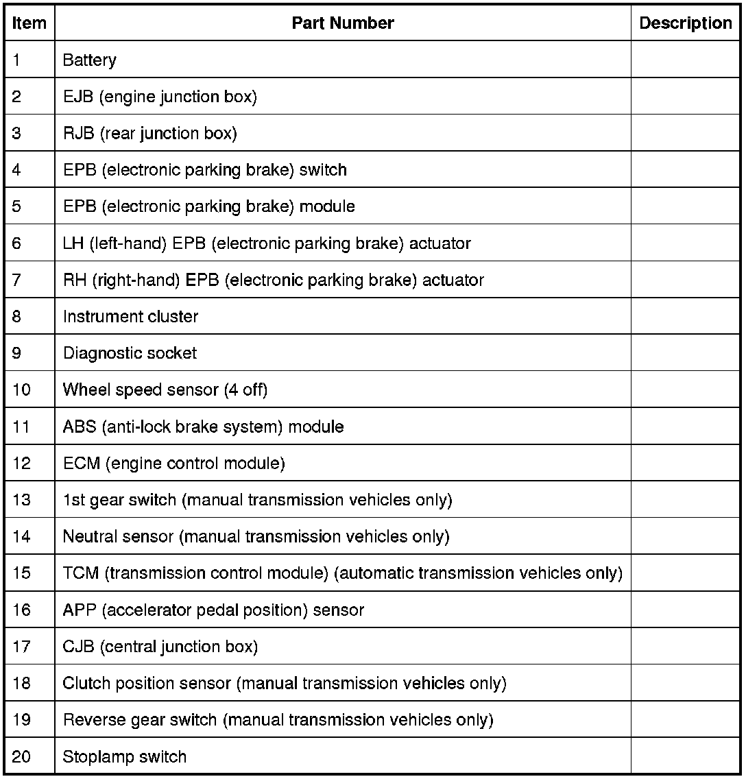 Separate battery power feeds for the EPB (electronic parking brake) actuators are supplied to the EPB (electronic parking brake) module from the RJB (rear junction box). A further power feed is supplied to the EPB (electronic parking brake) module from the ignition relay in the CJB (central junction box).