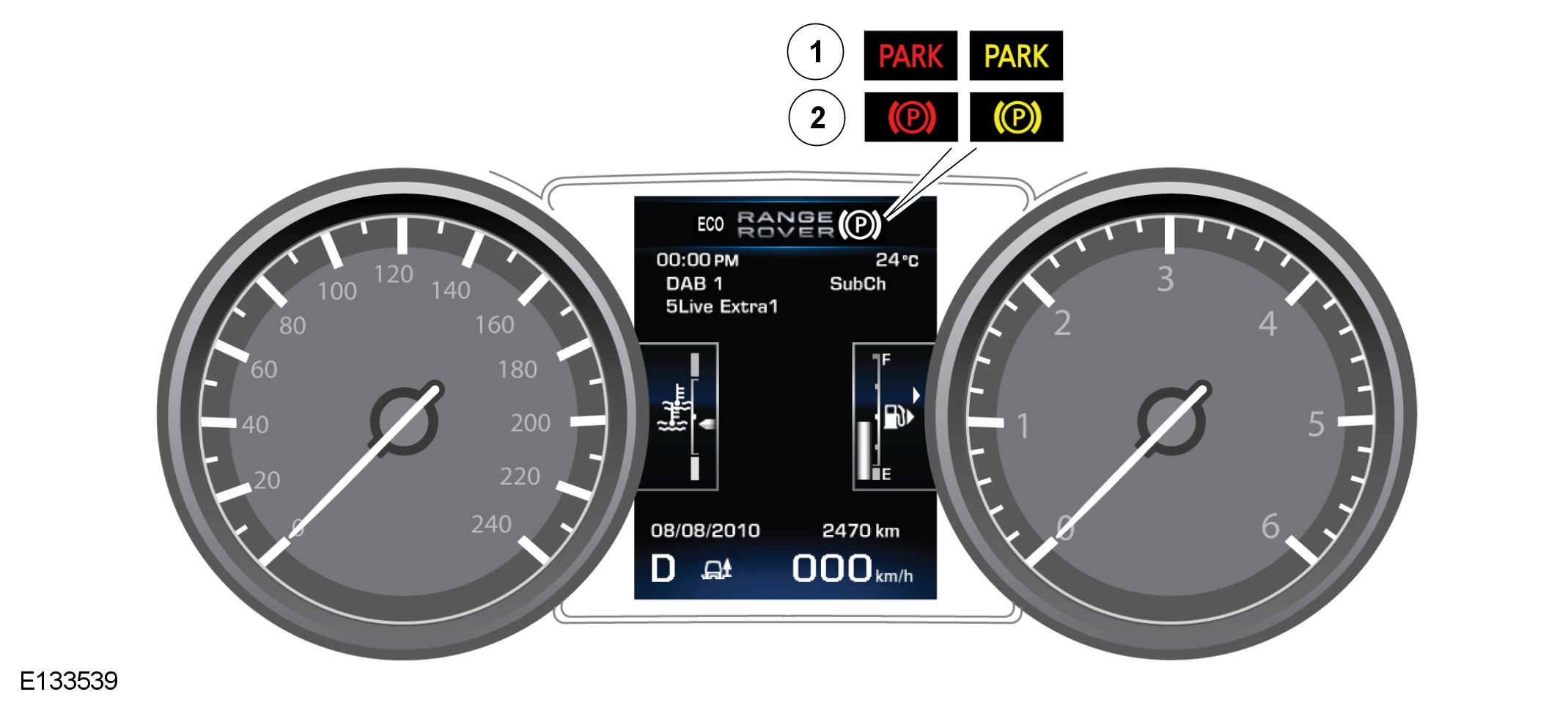 A parking brake warning indicator in the message center can be illuminated red or yellow. The EPB (electronic parking brake) module operates the warning indicator using high speed CAN (controller area network) messages to the instrument cluster. When the parking brake is applied in the static mode, the warning indicator is permanently illuminated red while the ignition is on, and for 10 seconds after the ignition is goes off. If a fault is detected while the parking brake is applied, the warning indicator flashes red. If a fault is detected while the parking brake is released, the warning indicator flashes yellow. All fault indications are accompanied by a related message displayed in the message center and a warning chime.