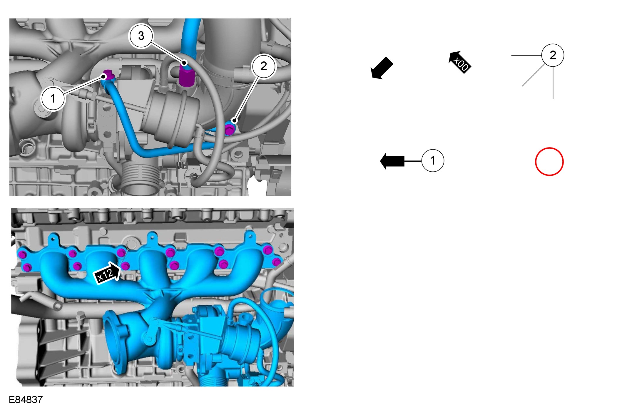 Pointer symbols are used to draw the attention to components and give special instructions such as a required sequence or number of components. The number of components is reflected by the value inside the luty arrow. A sequence number is located inside the circle. Numbers inside circles are also used to allocate special information such as tightening torques or chemicals to a particular component.
