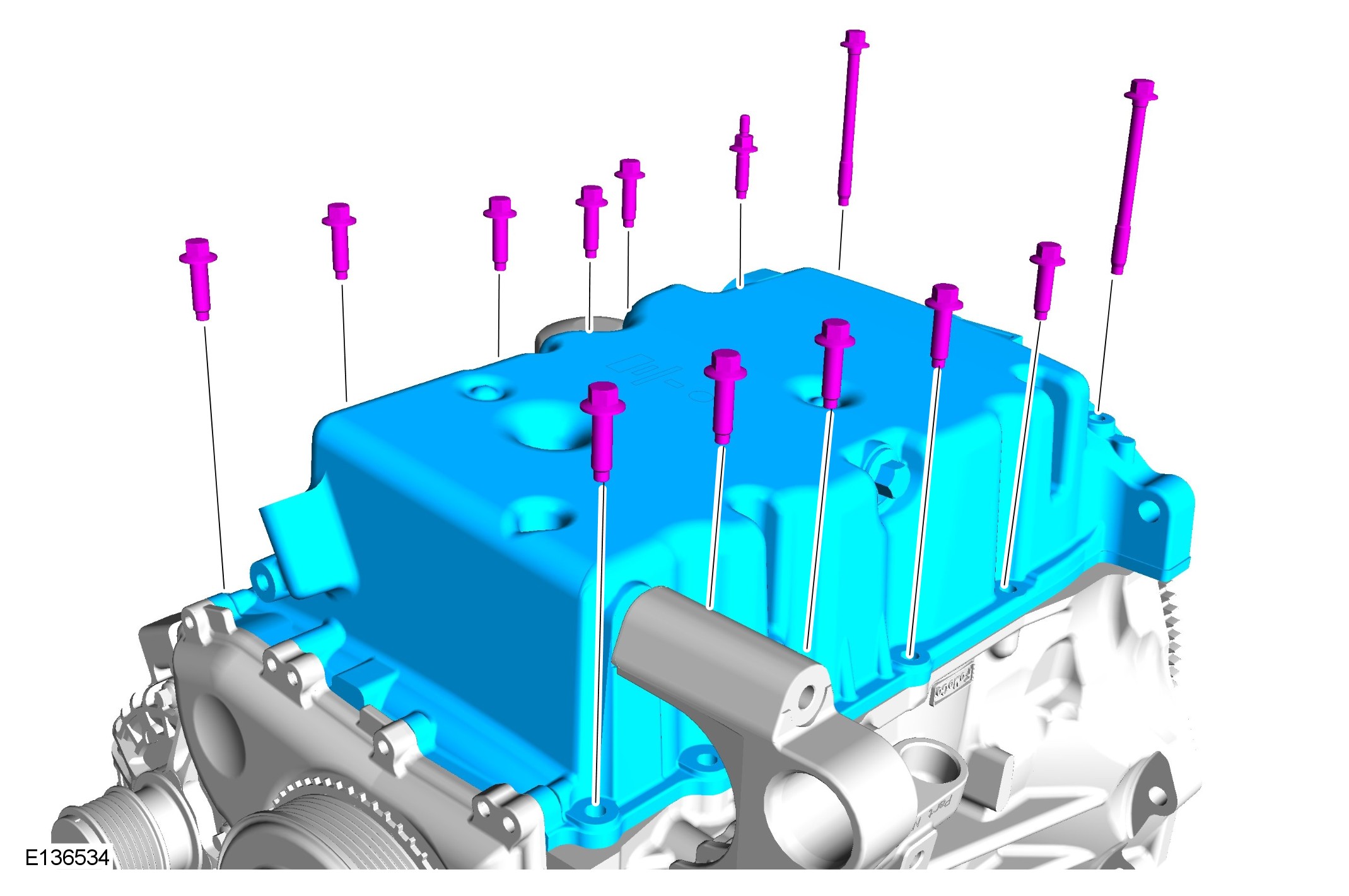 Note - TAS | Engine | Apply sealant WSE-M4G323-A6 in a 2-3mm diameter on the engine front cover as shown. The component must be installed and tightened within 10 minutes of sealant application.