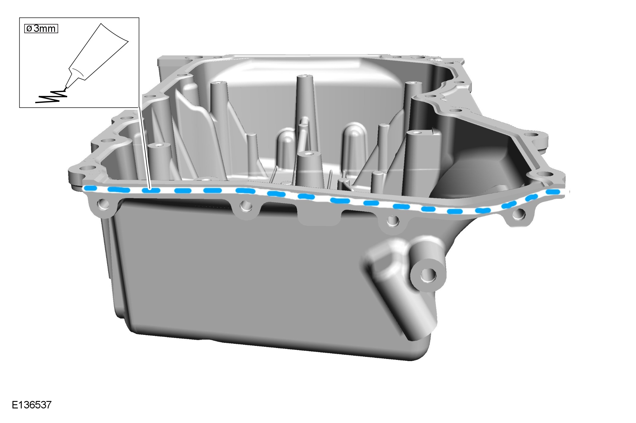 Note - Apply sealant WSE-M4G323-A6 in a 2-3mm diameter on the engine oil sump as shown. The component must be installed and tightened within 10 minutes of sealant application.
