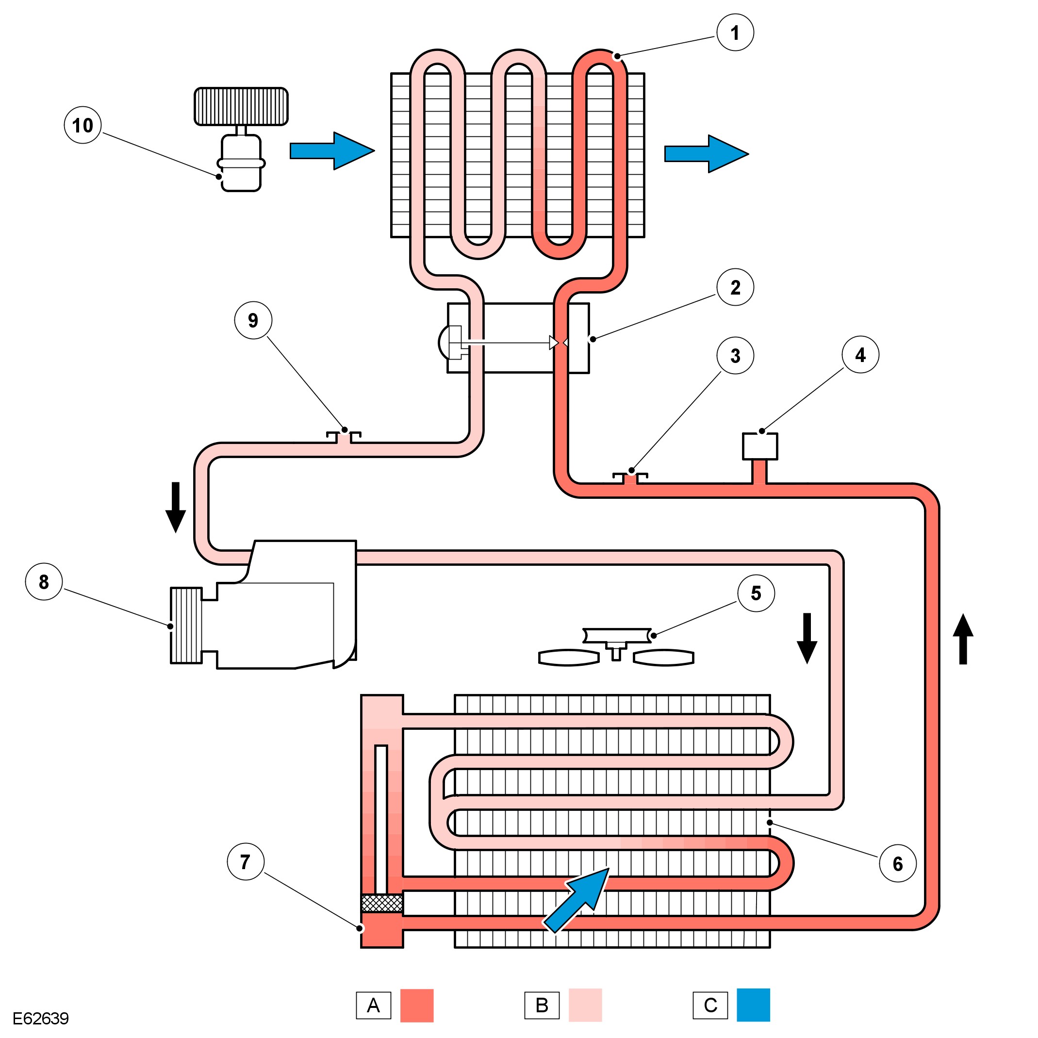 A = Refrigerant liquid; B = Refrigerant vapor; C = Air flow