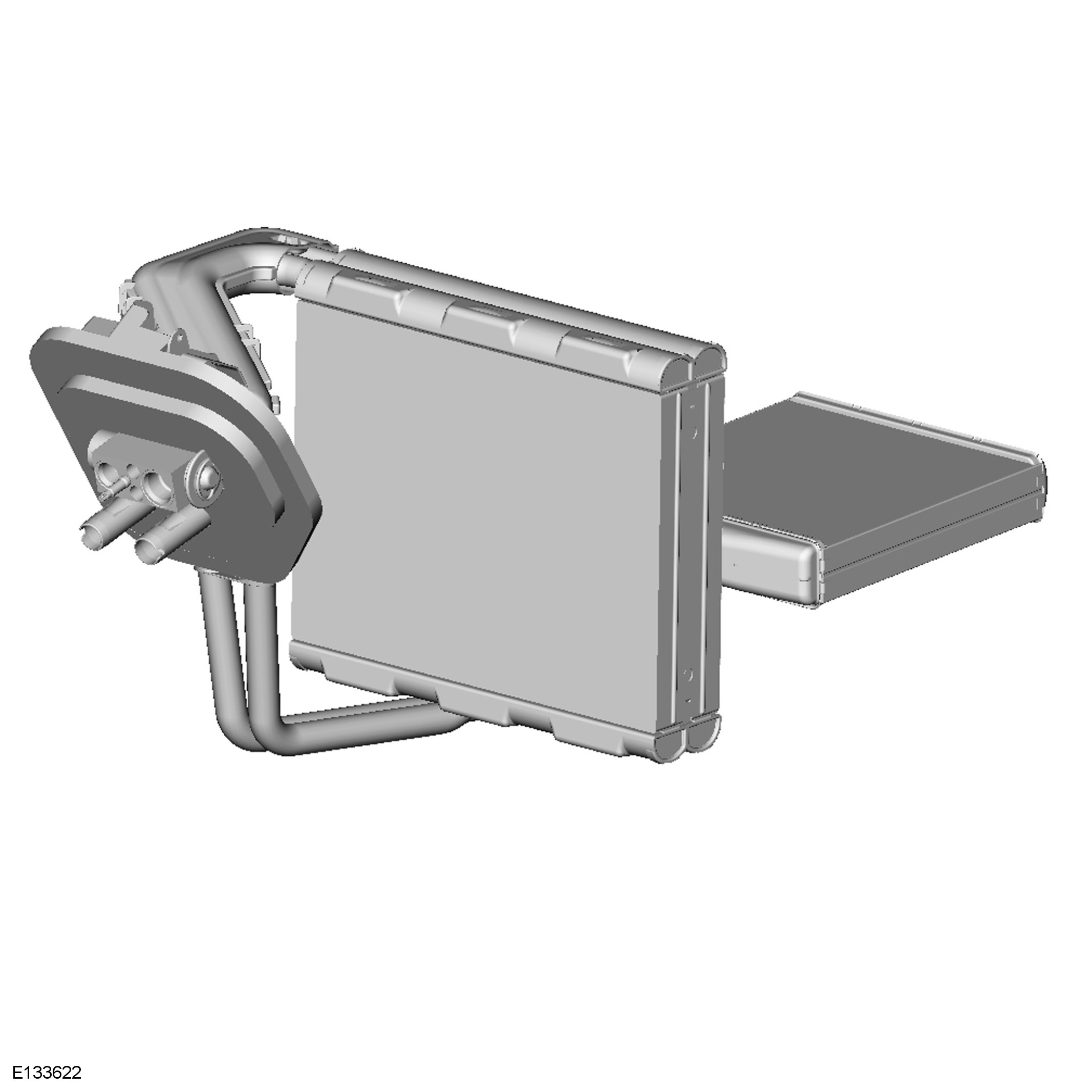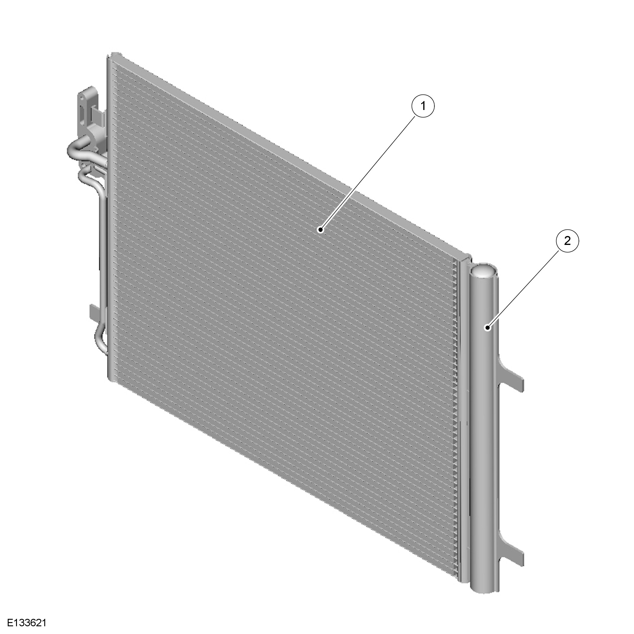 The RH (right-hand) end tank provides the connections to the high pressure line from the A/C (air conditioning) compressor and the low pressure line to the evaporator.