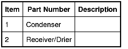 The condenser transfers heat from the refrigerant to the surrounding air to convert the high pressure vapor from the compressor into a liquid. The condenser is installed immediately in front of the radiator. Two brackets on each end tank attach the condenser to the end tanks of the radiator.