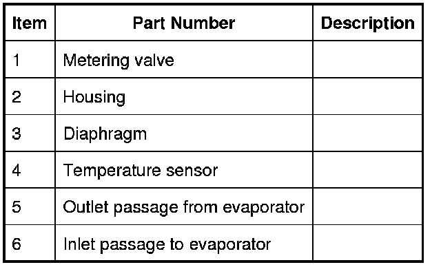The thermostatic expansion valve is a block type valve located behind the heater assembly, and attached to the inlet and outlet ports of the evaporator. The thermostatic expansion valve consists of an aluminum housing containing inlet and outlet passages. A ball and spring metering valve is installed in the inlet passage and a temperature sensor is installed in the outlet passage. The temperature sensor consists of a temperature sensitive tube connected to a diaphragm. The bottom end of the temperature sensitive tube acts on the ball of the metering valve. Pressure on top of the diaphragm is controlled by the evaporator outlet temperature conducted through the temperature sensitive tube. The bottom of the diaphragm senses evaporator outlet pressure.
