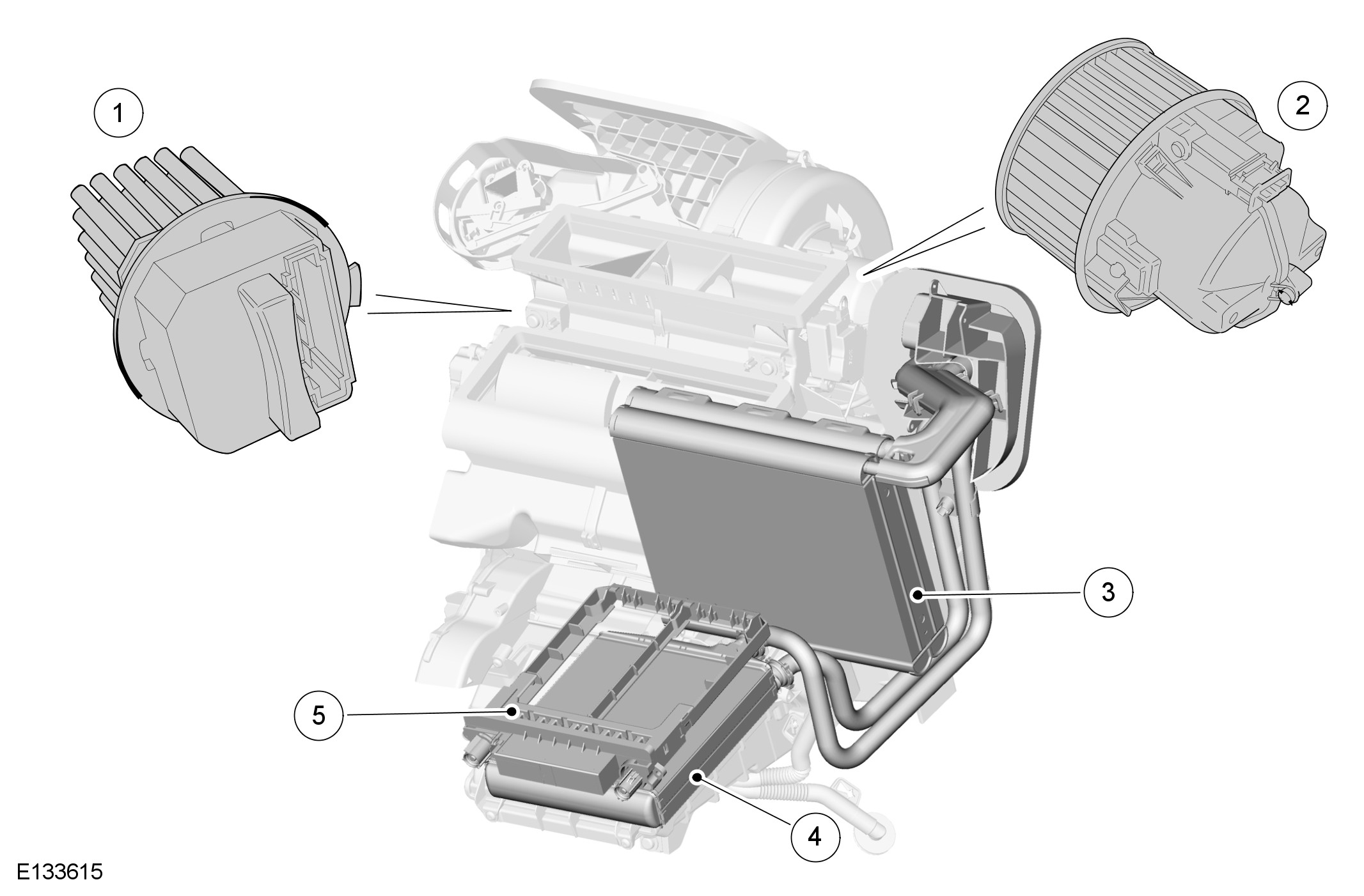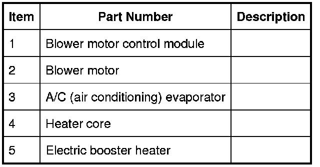The heater assembly controls the temperature of the air supplied to the air distribution ducts, as directed by the ATC (automatic temperature control) module. The heater assembly is mounted on the vehicle center line and comprises the following components: