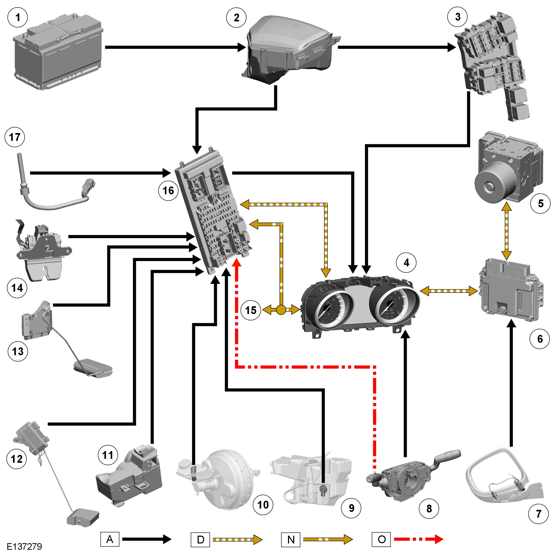 The instrument cluster receives a permanent battery voltage supply via a fuse in the RJB (rear junction box). High speed and medium speed CAN (controller area network) buses are also connected to the instrument cluster to receive information from other system control modules for instrument cluster functions.