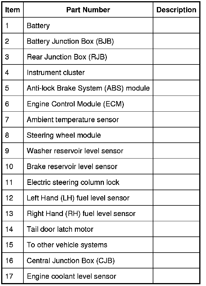 The steering column lock is connected directly to the instrument cluster. The steering wheel switches are also connected directly to the instrument cluster via the steering wheel module. Other vehicle sensors are connected to the CJB (central junction box) which processes the signals from the sensors and passes them to the instrument cluster on the high speed or medium speed CAN (controller area network) bus. The ambient temperature signal is received by the ECM (engine control module) which processes the signal and passes the information to the instrument cluster on the high speed CAN (controller area network) bus.