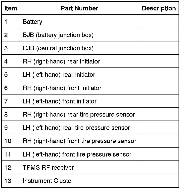 Each time the vehicle is driven, the CJB (central junction box) transmits a Low Frequency (LF) (125 KHz) signal to each initiator in turn. This is received by the tire pressure sensor which transmits a Radio Frequency (RF) (315 or 433 MHz depending on market) signal to the RF receiver. This signal contains coded data which corresponds to sensor identification, air pressure, air temperature and acceleration data. This signal is communicated to the CJB (central junction box) via a K-Line Bus.