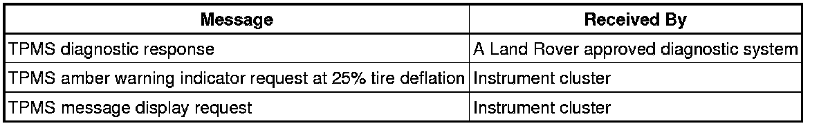 The CJB (central junction box) sends and receives a number of digital messages via CAN (controller area network). The received messages are used for the operation of the TPMS. The transmitted messages comprise of TPMS status and requests to the instrument cluster to illuminate warnings indicators and/or display messages in the message center.