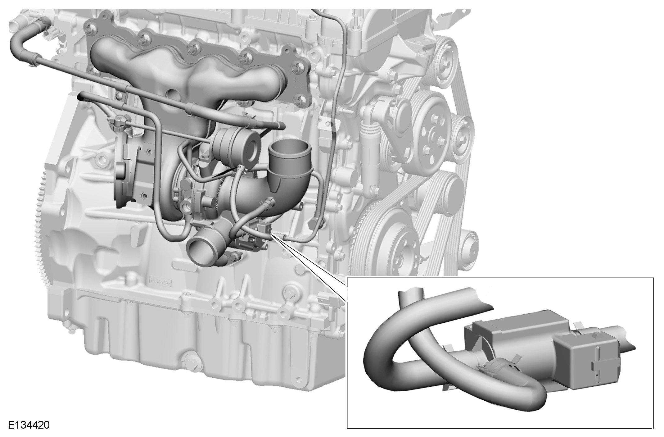 The wastegate control solenoid valve is attached to a bracket which is attached to the turbocharger compressor housing.