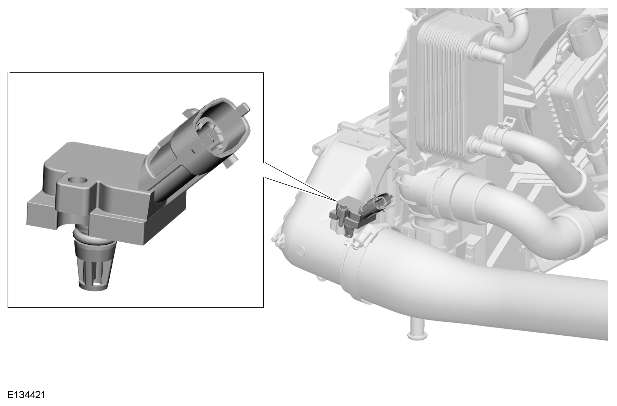 The boost air pressure and temperature sensor is located in the outlet elbow of the charge air cooler. The sensor is sealed in the cooler with an O ring seal and secured with a single bolt.
