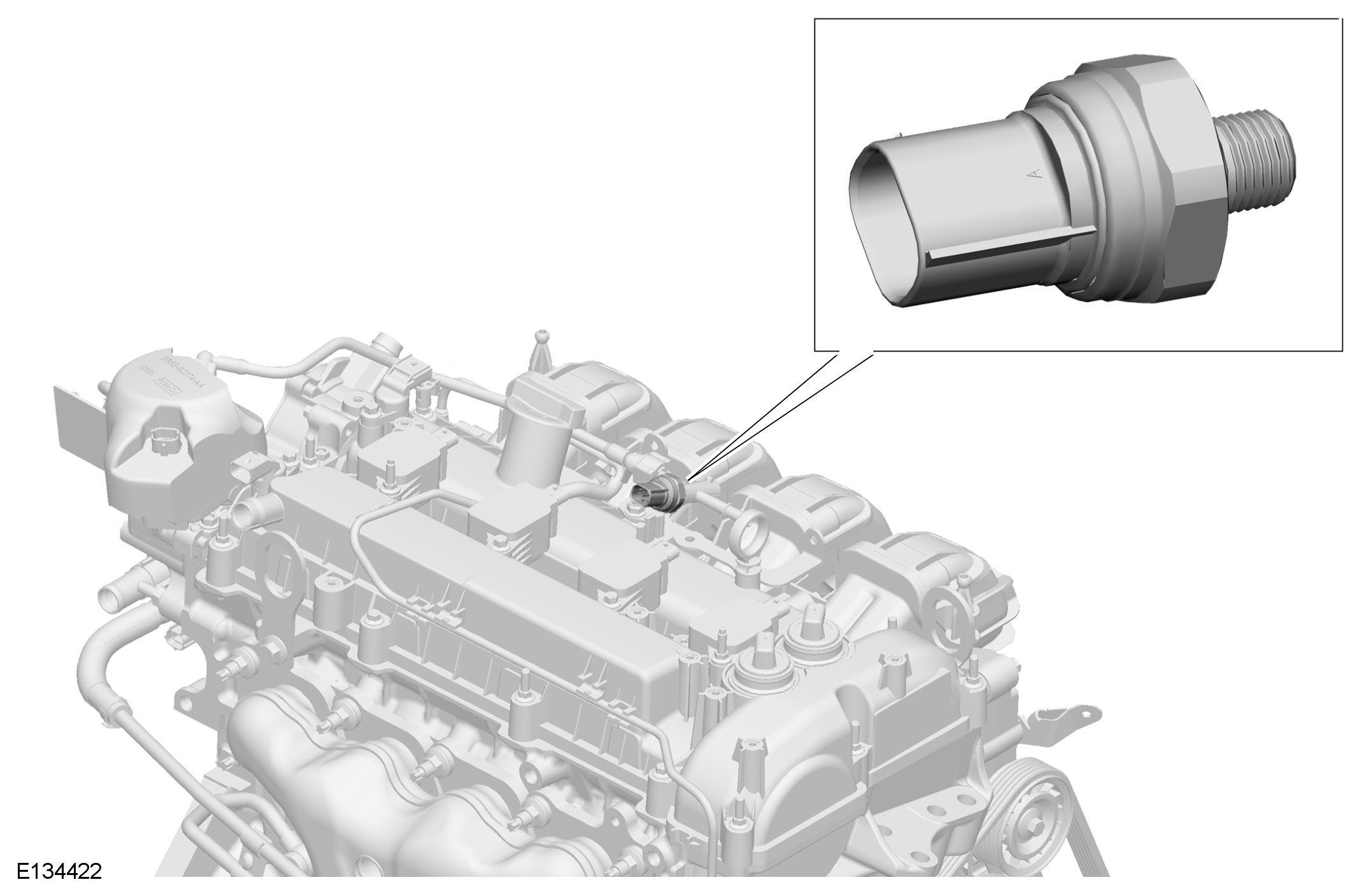 The LP fuel sensor is located on a bracket on the top of the engine. It is located in a connector between the fuel supply pipe from the fuel tank pump module and the LP supply pipe to the High Pressure (HP) fuel pump. The sensor measures the fuel pressure being supplied from the tank mounted fuel pump module to the High Pressure (HP) fuel pump.