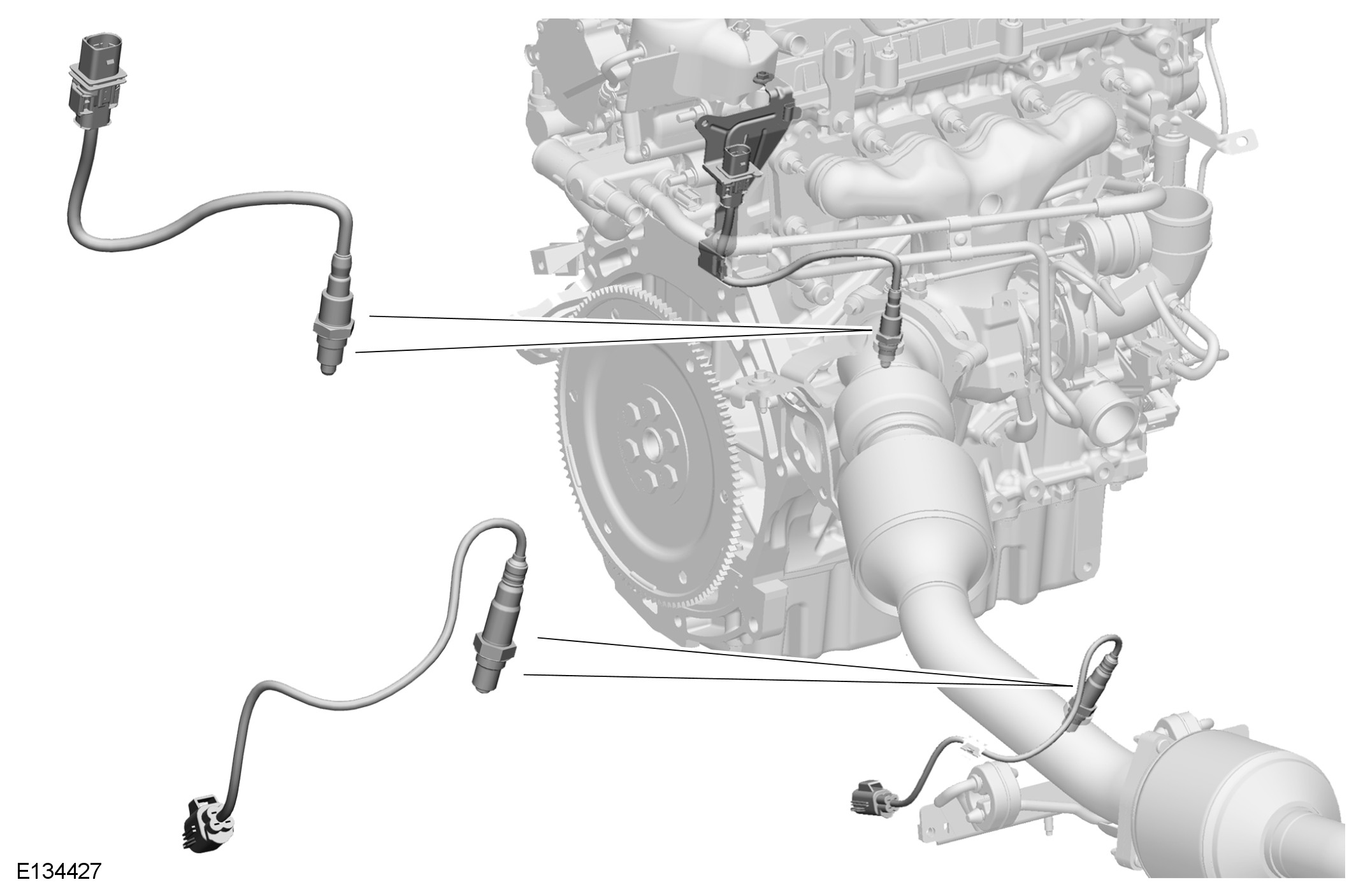 The HO2S (heated oxygen sensor) receive a fused 12V power supply from the ECM (engine control module) relay in the BJB (battery junction box). The front HO2S (heated oxygen sensor) is connected to the ECM (engine control module) on five wires and the rear HO2S (heated oxygen sensor) is connected to the ECM (engine control module) on three wires. The sensor connections provide power input, ground and analogue input and output to the ECM (engine control module).