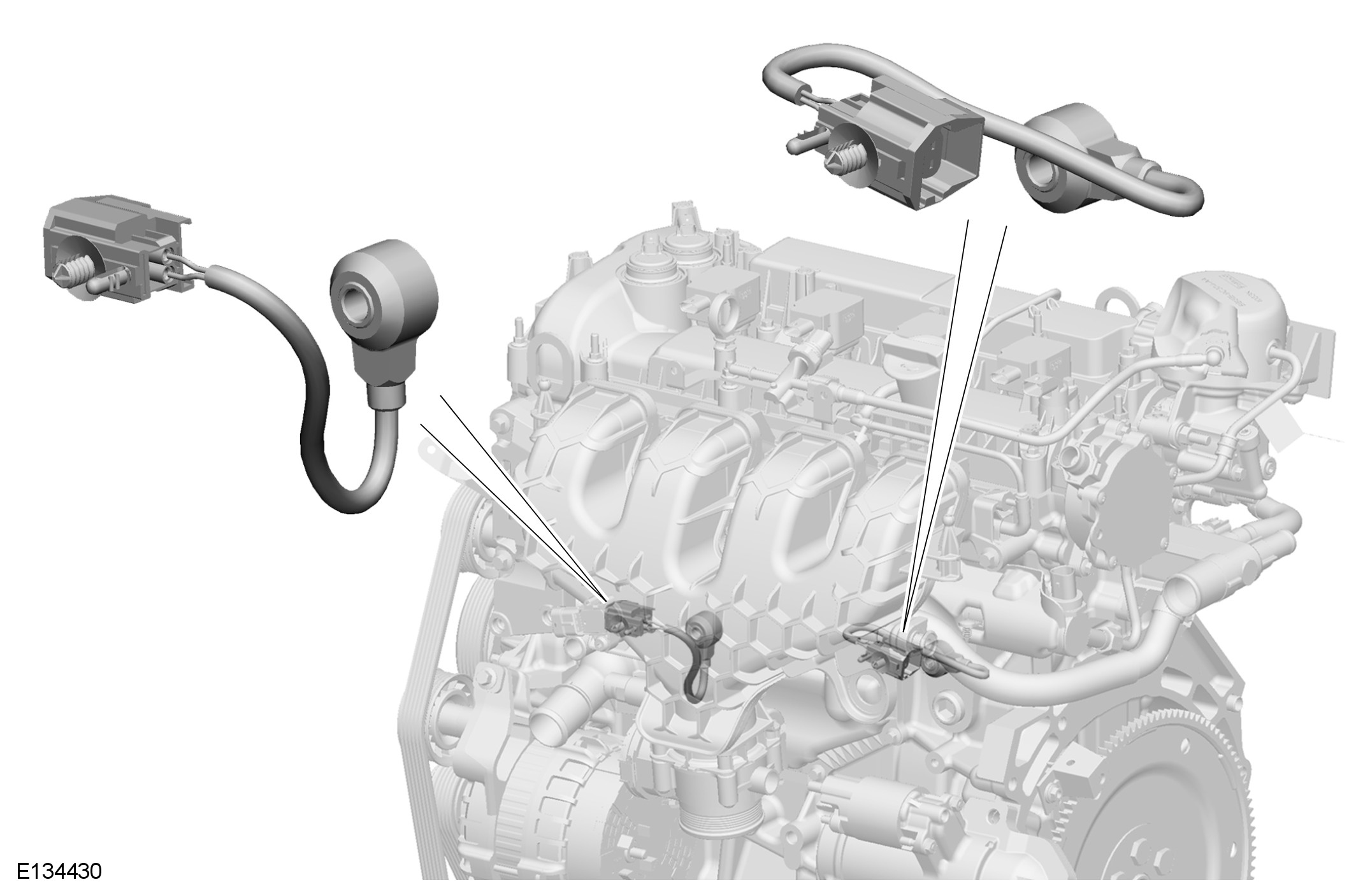 Two knock sensors are installed on the LH (left-hand) side of each cylinder block, below the intake manifold, one mid-way between cylinders 1 and 2, and one mid-way between cylinders 3 and 4. Each knock sensor is secured with a single screw. On each knock sensor, a two pin electrical connector provides the interface with the engine harness.