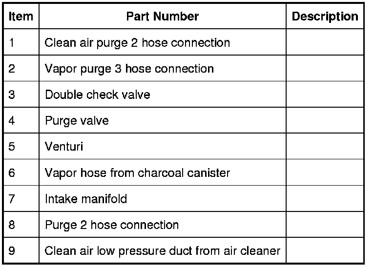 Vapor from the charcoal canister passes to the purge valve and cannot enter the air intake when the purge valve is closed (de-energized). When the purge valve is activated by the ECM (engine control module), fuel vapor passes through the purge valve to the double check valve. If the pressure in the intake manifold is lower than the pressure in the venturi, (for example under low load, low turbocharger boost conditions) the vapor is passed through the double check valve and enters the intake manifold via the purge 3 hose to the port after the electric throttle.