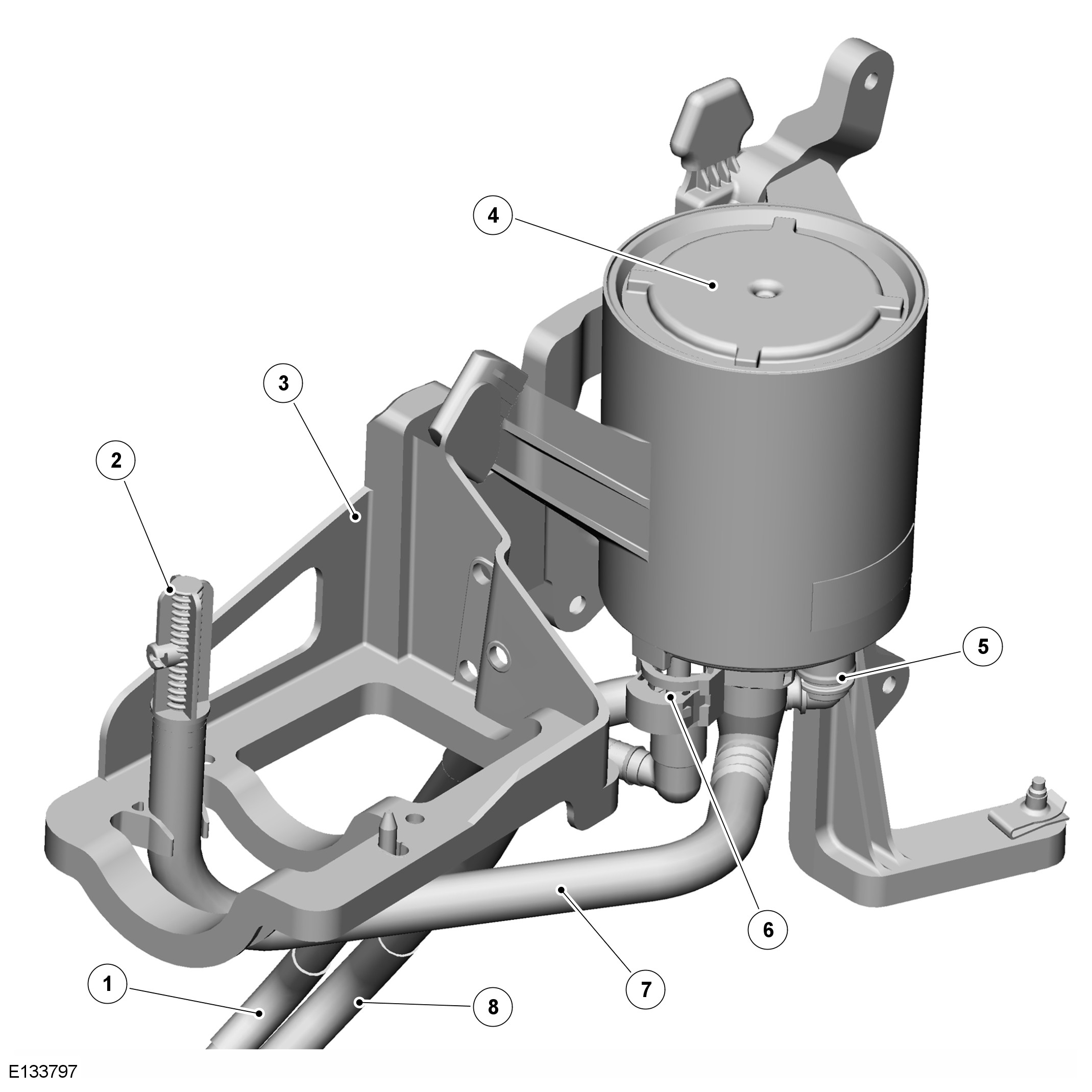 The charcoal canister is located in the LH (left-hand) rear wheel arch, above the wheel arch splash shield. A rubber grommet on the bracket is located in a corresponding bracket on the vehicle body. The rear of the canister bracket is secured to a second bracket on the vehicle body with a bolt and spring nut.