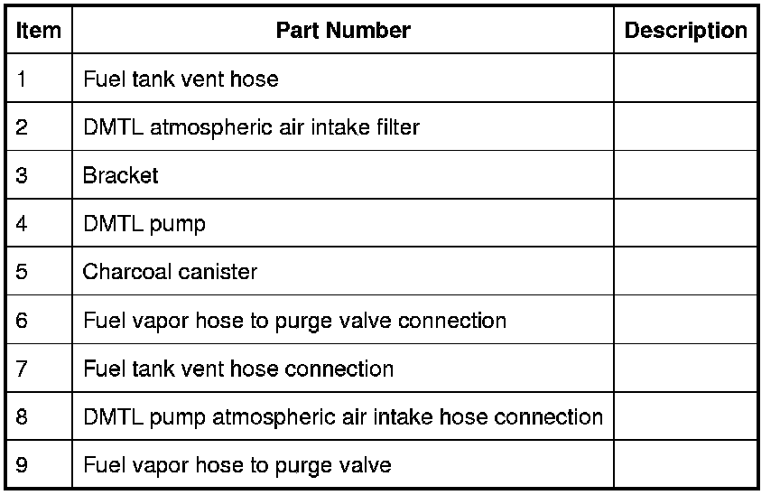 The DMTL pump and filter are located on the same bracket that mounts the charcoal canister. The pump is connected by a hose to atmospheric vent of the charcoal canister and incorporates a PTC (positive temperature coefficient) heating element, a normally open valve and a reference orifice.