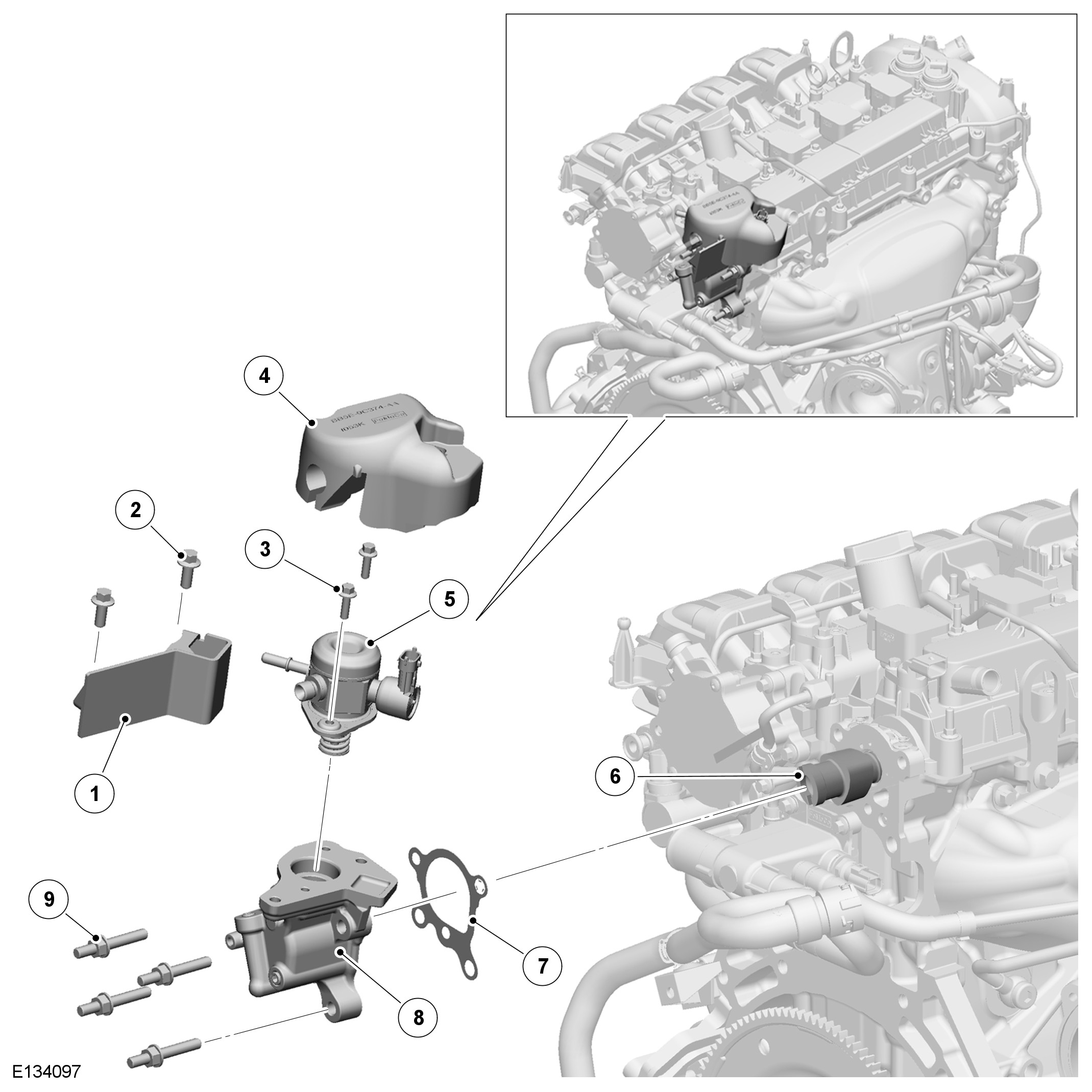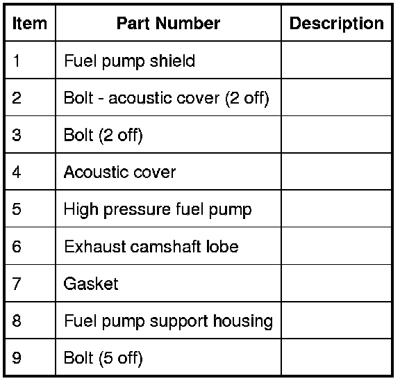 The high pressure fuel pump is located at the rear of the engine and is driven off the exhaust camshaft. The pump is mounted on a fuel pump support housing and secured with 2 bolts. The fuel pump support housing is attached to the cylinder head, sealed with a gasket and secured with 5 bolts.
