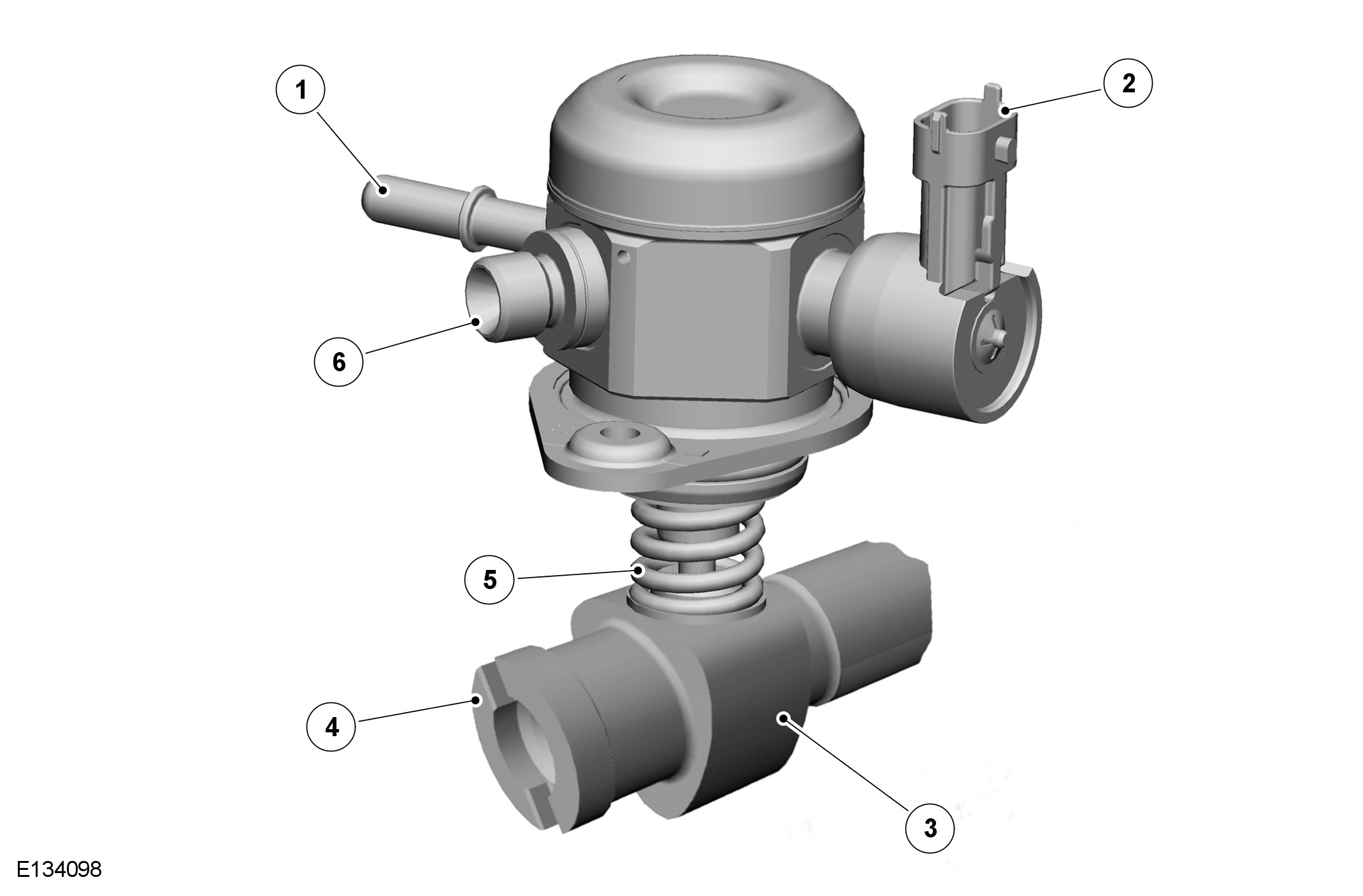 The high-pressure pump is mechanically driven by the camshaft via a plunger. During the downward stroke of the pump piston, fuel is delivered to the cylinder at a pressure supplied by the fuel tank mounted low pressure fuel pump. On the upward stroke of the piston the fuel in the cylinder is compressed. If the pressure from the pump exceeds the pressure in the fuel rail the fuel is delivered into the fuel rail via the high pressure outlet and a pipe.